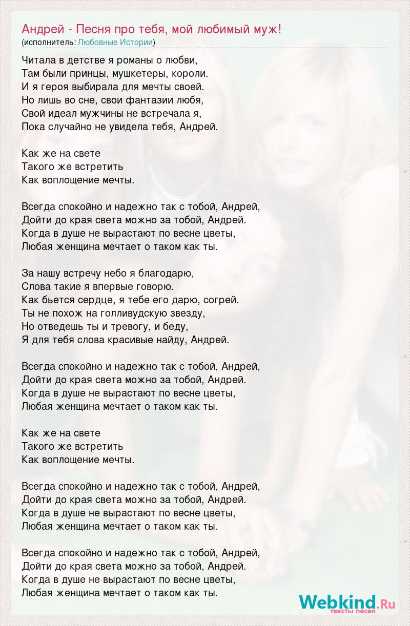 Читала в детстве я романы о любви, Там были принцы, мушкетеры, короли. И я героя выбирала для мечты своей. Но лишь во сне, свои фантазии любя, Свой идеал мужчины не встречала я, Пока случайно не увидела тебя, Андрей. Как же на свете Такого же встретить Как воплощение мечты. Всегда спокойно и надежно так с тобой, Андрей, Дойти до края света можно за тобой, Андрей. Когда в душе не вырастают по весне цветы, Любая женщина мечтает о таком как ты. За нашу встречу небо я благодарю, Слова такие я впервые говорю. Как бьется сердце, я тебе его дарю, согрей. Ты не похож на голливудскую звезду, Но отведешь ты и тревогу, и беду, Я для тебя слова красивые найду, Андрей. Всегда спокойно и надежно так с тобой, Андрей, Дойти до края света можно за тобой, Андрей. Когда в душе не вырастают по весне цветы, Любая женщина мечтает о таком как ты. Как же на свете Такого же встретить Как воплощение мечты. Всегда спокойно и надежно так с тобой, Андрей, Дойти до края света можно за тобой, Андрей. Когда в душе не вырастают по весне цветы, Любая женщина мечтает о таком как ты. Всегда спокойно и надежно так с тобой, Андрей, Дойти до края света можно за тобой, Андрей. Когда в душе не вырастают по весне цветы, Любая женщина мечтает о таком как ты.