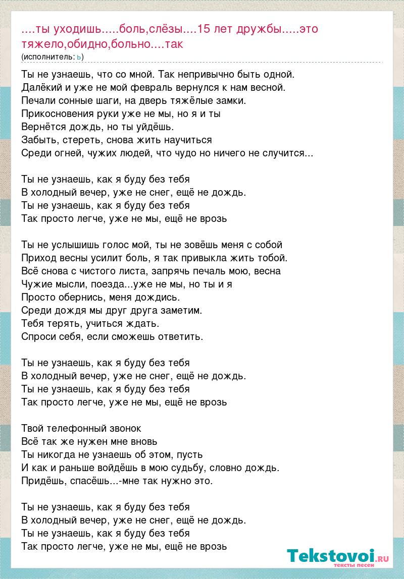 Ты не узнаешь, что со мной. Так непривычно быть одной. Далёкий и уже не мой февраль вернулся к нам весной. Печали сонные шаги, на дверь тяжёлые замки. Прикосновения руки уже не мы, но я и ты Вернётся дождь, но ты уйдёшь. Забыть, стереть, снова жить научиться Среди огней, чужих людей, что чудо но ничего не случится... Ты не узнаешь, как я буду без тебя В холодный вечер, уже не снег, ещё не дождь. Ты не узнаешь, как я буду без тебя Так просто легче, уже не мы, ещё не врозь Ты не услышишь голос мой, ты не зовёшь меня с собой Приход весны усилит боль, я так привыкла жить тобой. Всё снова с чистого листа, запрячь печаль мою, весна Чужие мысли, поезда...уже не мы, но ты и я Просто обернись, меня дождись. Среди дождя мы друг друга заметим. Тебя терять, учиться ждать. Спроси себя, если сможешь ответить. Ты не узнаешь, как я буду без тебя В холодный вечер, уже не снег, ещё не дождь. Ты не узнаешь, как я буду без тебя Так просто легче, уже не мы, ещё не врозь Твой телефонный звонок Всё так же нужен мне вновь Ты никогда не узнаешь об этом, пусть И как и раньше войдёшь в мою судьбу, словно дождь. Придёшь, спасёшь...-мне так нужно это. Ты не узнаешь, как я буду без тебя В холодный вечер, уже не снег, ещё не дождь. Ты не узнаешь, как я буду без тебя Так просто легче, уже не мы, ещё не врозь