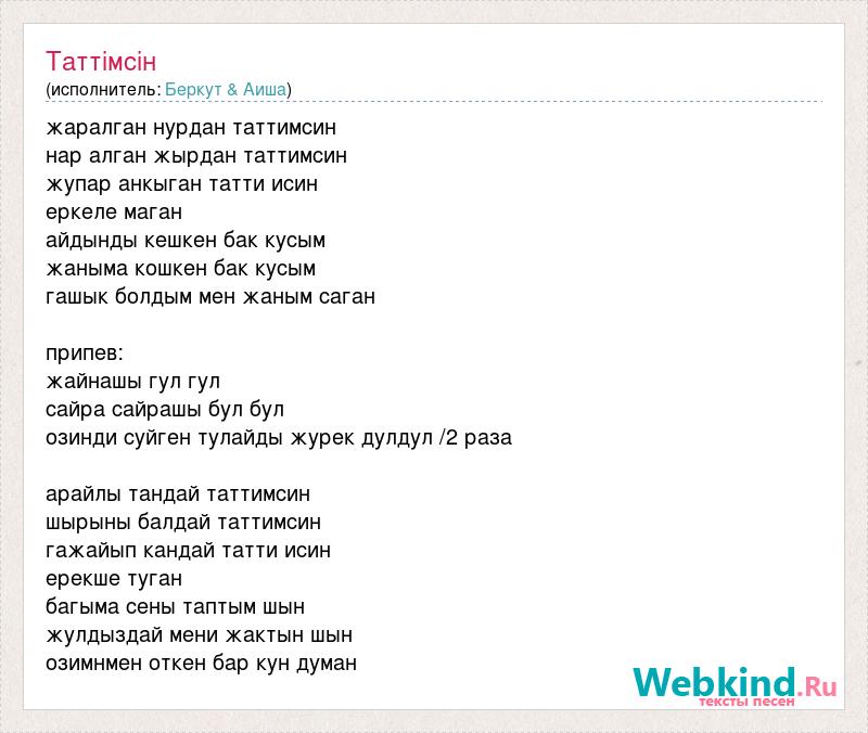 жаралган нурдан таттимсин нар алган жырдан таттимсин жупар анкыган татти исин еркеле маган айдынды кешкен бак кусым жаныма кошкен бак кусым гашык болдым мен жаным саган припев: жайнашы гул гул сайра сайрашы бул бул озинди суйген тулайды журек дулдул /2 раза арайлы тандай таттимсин шырыны балдай таттимсин гажайып кандай татти исин ерекше туган багыма сены таптым шын жулдыздай мени жактын шын озимнмен откен бар кун думан