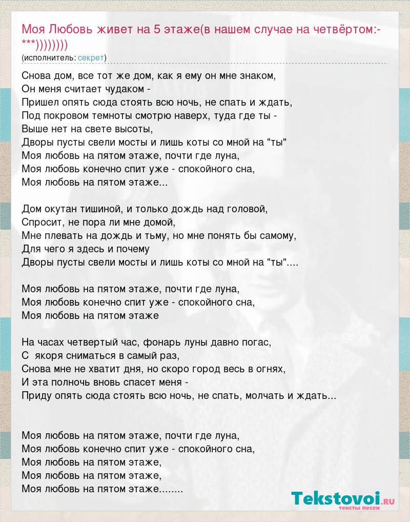 Снова дом, все тот же дом, как я ему он мне знаком, Он меня считает чудаком - Пришел опять сюда стоять всю ночь, не спать и ждать, Под покровом темноты смотрю наверх, туда где ты - Выше нет на свете высоты, Дворы пусты свели мосты и лишь коты со мной на "ты" Моя любовь на пятом этаже, почти где луна, Моя любовь конечно спит уже - спокойного сна, Моя любовь на пятом этаже... Дом окутан тишиной, и только дождь над головой, Спросит, не пора ли мне домой, Мне плевать на дождь и тьму, но мне понять бы самому, Для чего я здесь и почему Дворы пусты свели мосты и лишь коты со мной на "ты".... Моя любовь на пятом этаже, почти где луна, Моя любовь конечно спит уже - спокойного сна, Моя любовь на пятом этаже На часах четвертый час, фонарь луны давно погас, С якоря сниматься в самый раз, Снова мне не хватит дня, но скоро город весь в огнях, И эта полночь вновь спасет меня - Приду опять сюда стоять всю ночь, не спать, молчать и ждать... Моя любовь на пятом этаже, почти где луна, Моя любовь конечно спит уже - спокойного сна, Моя любовь на пятом этаже, Моя любовь на пятом этаже, Моя любовь на пятом этаже........