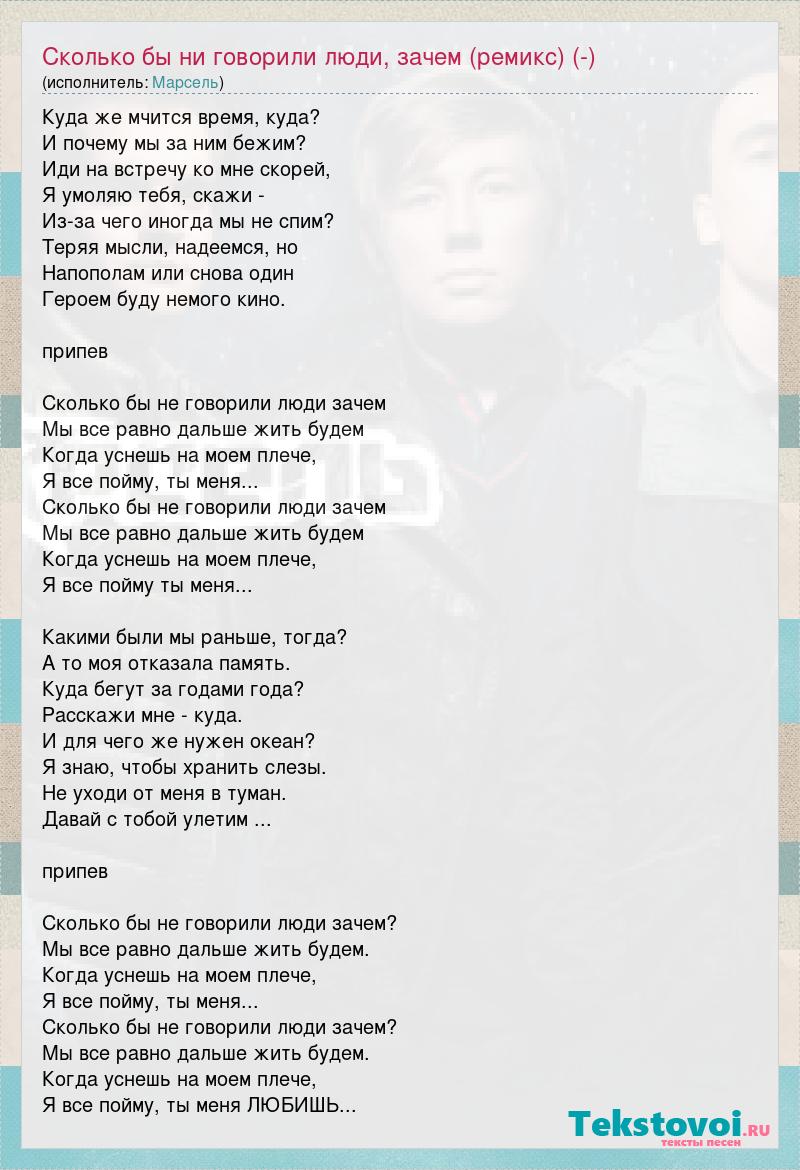 Куда же мчится время, куда? И почему мы за ним бежим? Иди на встречу ко мне скорей, Я умоляю тебя, скажи - Из-за чего иногда мы не спим? Теряя мысли, надеемся, но Напополам или снова один Героем буду немого кино. припев Сколько бы не говорили люди зачем Мы все равно дальше жить будем Когда уснешь на моем плече, Я все пойму, ты меня... Сколько бы не говорили люди зачем Мы все равно дальше жить будем Когда уснешь на моем плече, Я все пойму ты меня... Какими были мы раньше, тогда? А то моя отказала память. Куда бегут за годами года? Расскажи мне - куда. И для чего же нужен океан? Я знаю, чтобы хранить слезы. Не уходи от меня в туман. Давай с тобой улетим ... припев Сколько бы не говорили люди зачем? Мы все равно дальше жить будем. Когда уснешь на моем плече, Я все пойму, ты меня... Сколько бы не говорили люди зачем? Мы все равно дальше жить будем. Когда уснешь на моем плече, Я все пойму, ты меня ЛЮБИШЬ...