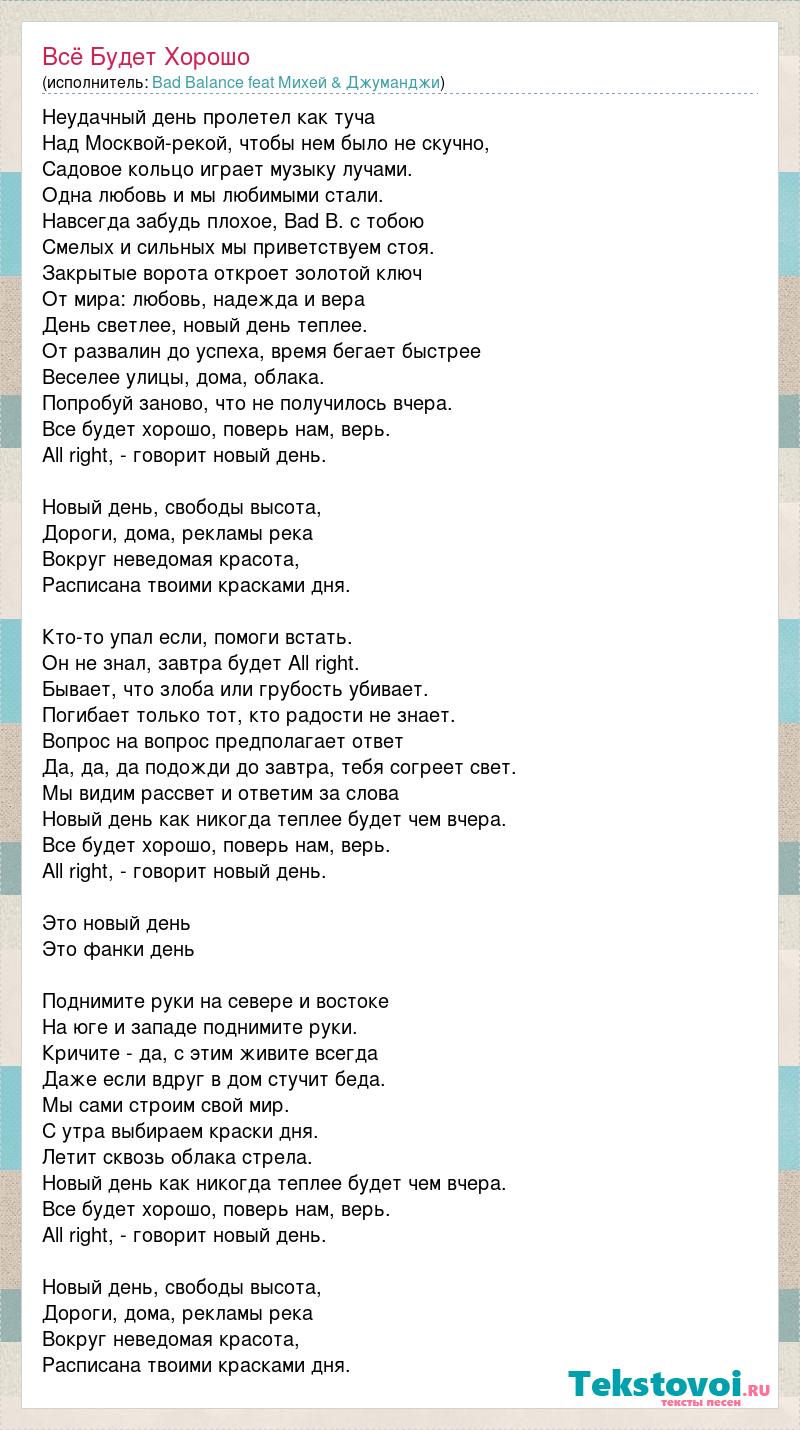 Неудачный день пролетел как туча Над Москвой-рекой, чтобы нем было не скучно, Садовое кольцо играет музыку лучами. Одна любовь и мы любимыми стали. Навсегда забудь плохое, Bad B. с тобою Смелых и сильных мы приветствуем стоя. Закрытые ворота откроет золотой ключ От мира: любовь, надежда и вера День светлее, новый день теплее. От развалин до успеха, время бегает быстрее Веселее улицы, дома, облака. Попробуй заново, что не получилось вчера. Все будет хорошо, поверь нам, верь. All right, - говорит новый день. Новый день, свободы высота, Дороги, дома, рекламы река Вокруг неведомая красота, Расписана твоими красками дня. Кто-то упал если, помоги встать. Он не знал, завтра будет All right. Бывает, что злоба или грубость убивает. Погибает только тот, кто радости не знает. Вопрос на вопрос предполагает ответ Да, да, да подожди до завтра, тебя согреет свет. Мы видим рассвет и ответим за слова Новый день как никогда теплее будет чем вчера. Все будет хорошо, поверь нам, верь. All right, - говорит новый день. Это новый день Это фанки день Поднимите руки на севере и востоке На юге и западе поднимите руки. Кричите - да, с этим живите всегда Даже если вдруг в дом стучит беда. Мы сами строим свой мир. С утра выбираем краски дня. Летит сквозь облака стрела. Новый день как никогда теплее будет чем вчера. Все будет хорошо, поверь нам, верь. All right, - говорит новый день. Новый день, свободы высота, Дороги, дома, рекламы река Вокруг неведомая красота, Расписана твоими красками дня.