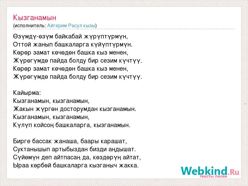 Өзүмдү-өзүм байкабай жүрүптүрмүн, Оттой жанып башкаларга күйүптүрмүн. Көрөр замат көчөдөн башка кыз менен, Жүрөгүмдө пайда болду бир сезим күчтүү. Көрөр замат көчөдөн башка кыз менен, Жүрөгүмдө пайда болду бир сезим күчтүү. Кайырма: Кызганамын, кызганамын, Жакын жүргөн досторумдан кызганамын. Кызганамын, кызганамын, Күлүп койсоң башкаларга, кызганамын. Бирге бассак жанаша, баары карашат, Суктанышып артыбыздан бизди аңдышат. Сүйөмүн деп айтпасаң да, көздөрүң айтат, Ыраа көрбөй башкаларга кызганыч жакка.