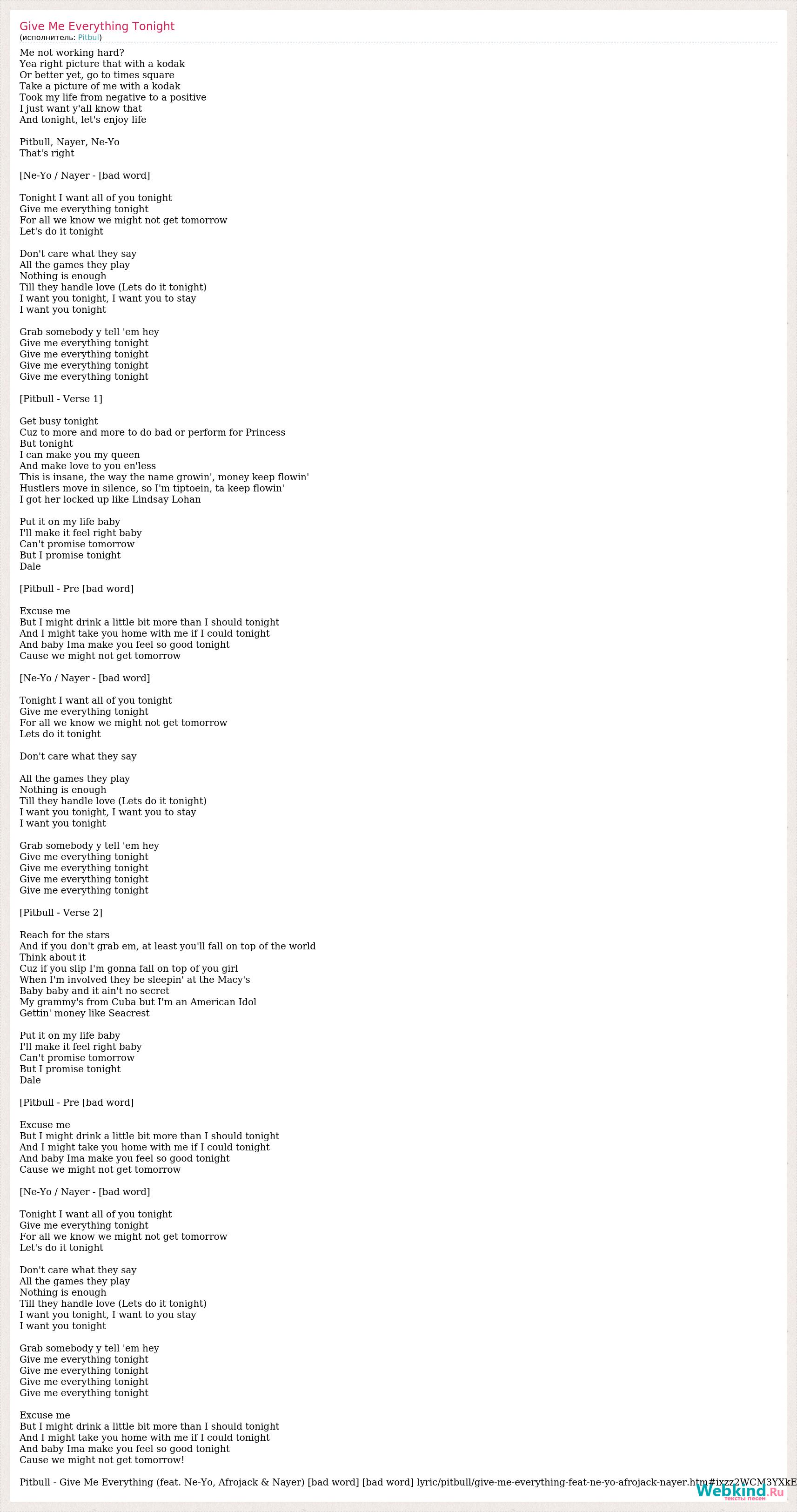 Me not working hard? Yea right picture that with a kodak Or better yet, go to times square Take a picture of me with a kodak Took my life from negative to a positive I just want y'all know that And tonight, let's enjoy life Pitbull, Nayer, Ne-Yo That's right [Ne-Yo / Nayer - [bad word] Tonight I want all of you tonight Give me everything tonight For all we know we might not get tomorrow Let's do it tonight Don't care what they say All the games they play Nothing is enough Till they handle love (Lets do it tonight) I want you tonight, I want you to stay I want you tonight Grab somebody y tell 'em hey Give me everything tonight Give me everything tonight Give me everything tonight Give me everything tonight [Pitbull - Verse 1] Get busy tonight Cuz to more and more to do bad or perform for Princess But tonight I can make you my queen And make love to you en'less This is insane, the way the name growin', money keep flowin' Hustlers move in silence, so I'm tiptoein, ta keep flowin' I got her locked up like Lindsay Lohan Put it on my life baby I'll make it feel right baby Can't promise tomorrow But I promise tonight Dale [Pitbull - Pre [bad word] Excuse me But I might drink a little bit more than I should tonight And I might take you home with me if I could tonight And baby Ima make you feel so good tonight Cause we might not get tomorrow [Ne-Yo / Nayer - [bad word] Tonight I want all of you tonight Give me everything tonight For all we know we might not get tomorrow Lets do it tonight Don't care what they say All the games they play Nothing is enough Till they handle love (Lets do it tonight) I want you tonight, I want you to stay I want you tonight Grab somebody y tell 'em hey Give me everything tonight Give me everything tonight Give me everything tonight Give me everything tonight [Pitbull - Verse 2] Reach for the stars And if you don't grab em, at least you'll fall on top of the world Think about it Cuz if you slip I'm gonna fall on top of you girl When I'm involved they be sleepin' at the Macy's Baby baby and it ain't no secret My grammy's from Cuba but I'm an American Idol Gettin' money like Seacrest Put it on my life baby I'll make it feel right baby Can't promise tomorrow But I promise tonight Dale [Pitbull - Pre [bad word] Excuse me But I might drink a little bit more than I should tonight And I might take you home with me if I could tonight And baby Ima make you feel so good tonight Cause we might not get tomorrow [Ne-Yo / Nayer - [bad word] Tonight I want all of you tonight Give me everything tonight For all we know we might not get tomorrow Let's do it tonight Don't care what they say All the games they play Nothing is enough Till they handle love (Lets do it tonight) I want you tonight, I want to you stay I want you tonight Grab somebody y tell 'em hey Give me everything tonight Give me everything tonight Give me everything tonight Give me everything tonight Excuse me But I might drink a little bit more than I should tonight And I might take you home with me if I could tonight And baby Ima make you feel so good tonight Cause we might not get tomorrow! Pitbull - Give Me Everything (feat. Ne-Yo, Afrojack & Nayer) [bad word] [bad word] lyric/pitbull/give-me-everything-feat-ne-yo-afrojack-nayer.htm#ixzz2WCM3YXkE