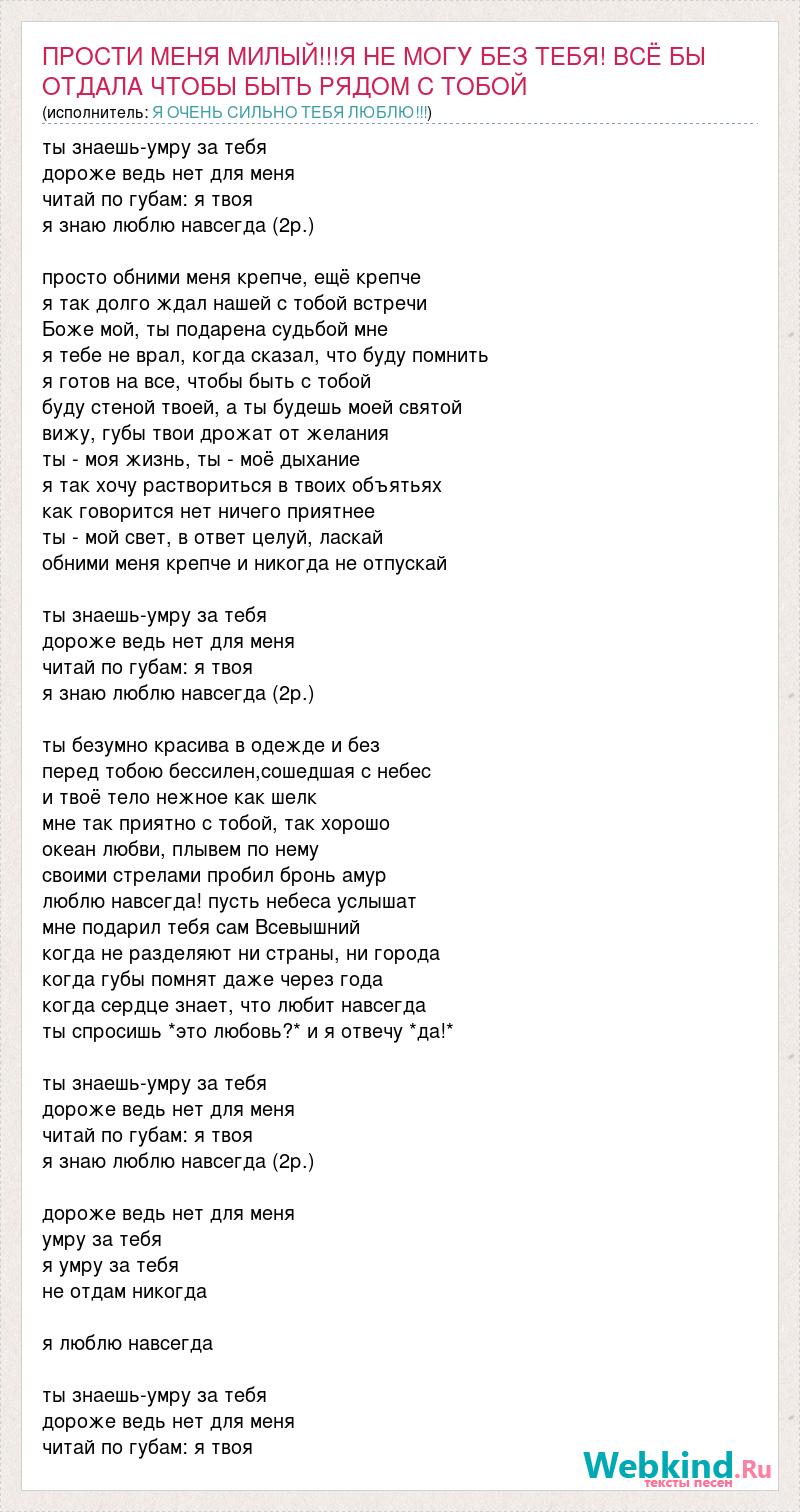 ты знаешь-умру за тебя дороже ведь нет для меня читай по губам: я твоя я знаю люблю навсегда (2р.) просто обними меня крепче, ещё крепче я так долго ждал нашей с тобой встречи Боже мой, ты подарена судьбой мне я тебе не врал, когда сказал, что буду помнить я готов на все, чтобы быть с тобой буду стеной твоей, а ты будешь моей святой вижу, губы твои дрожат от желания ты - моя жизнь, ты - моё дыхание я так хочу раствориться в твоих объятьях как говорится нет ничего приятнее ты - мой свет, в ответ целуй, ласкай обними меня крепче и никогда не отпускай ты знаешь-умру за тебя дороже ведь нет для меня читай по губам: я твоя я знаю люблю навсегда (2р.) ты безумно красива в одежде и без перед тобою бессилен,сошедшая с небес и твоё тело нежное как шелк мне так приятно с тобой, так хорошо океан любви, плывем по нему своими стрелами пробил бронь амур люблю навсегда! пусть небеса услышат мне подарил тебя сам Всевышний когда не разделяют ни страны, ни города когда губы помнят даже через года когда сердце знает, что любит навсегда ты спросишь *это любовь?* и я отвечу *да!* ты знаешь-умру за тебя дороже ведь нет для меня читай по губам: я твоя я знаю люблю навсегда (2р.) дороже ведь нет для меня умру за тебя я умру за тебя не отдам никогда я люблю навсегда ты знаешь-умру за тебя дороже ведь нет для меня читай по губам: я твоя