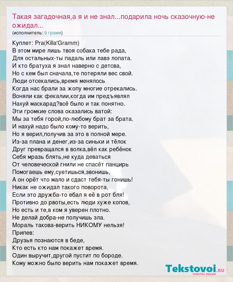Куплет: Pra(Killa'Gramm) В этом мире лишь твоя собака тебе рада, Для остальных-ты падаль или лавэ лопата. И кто братуха я знал наверно с детсва, Но с кем был сначала,те потеряли вес свой. Люди отсекались,время менялось Когда нас брали за жопу многие отрекались. Воняли как фекалии,когда им предъявлял Нахуй маскарад?всё было и так понятно. Эти громкие слова оказались ватой: Мы за тебя горой,по-любому брат за брата. И нахуй надо было кому-то верить, Но я верил,получив за это в полной мере. Из-за плана и денег,из-за синьки и тёлок Друг превращался в волка,вёл как ребёнок Себя мразь блять,не куда деваться От человеческой гнили не спасёт панцирь Помогаешь ему,суетишься,звонишь, А он орёт что мало и сдаст тебя-ты гонишь! Никак не ожидал такого поворота, Если это дружба-то ебал я её в рот бля! Противно до рвоты,есть люди хуже копов, Но есть и те,в ком я уверен плотно. Не делай добра-не получишь зла. Мораль такова-верить НИКОМУ нельзя! Припев: Друзья познаются в беде, Кто есть кто нам покажет время. Один выручит,другой пустит по бороде. Кому можно было верить нам покажет время.