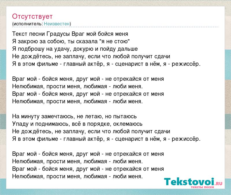 Текст песни Градусы Враг мой бойся меня Я закрою за собою, ты сказала "я не стою" Я подброшу на удачу, докурю и пойду дальше Не дождётесь, не заплачу, если что любой получит сдачи Я в этом фильме - главный актёр, я - сценарист в нём, я - режиссёр. Враг мой - бойся меня, друг мой - не отрекайся от меня Нелюбимая, прости меня, любимая - люби меня. Враг мой - бойся меня, друг мой - не отрекайся от меня Нелюбимая, прости меня, любимая - люби меня. На минуту замечтаюсь, не летаю, но пытаюсь Упаду и поднимаюсь, всё в порядке, оклемаюсь Не дождётесь, не заплачу, если что любой получит сдачи Я в этом фильме - главный актёр, я - сценарист в нём, я - режиссёр. Враг мой - бойся меня, друг мой - не отрекайся от меня Нелюбимая, прости меня, любимая - люби меня. Враг мой - бойся меня, друг мой - не отрекайся от меня Нелюбимая, прости меня, любимая - люби меня.