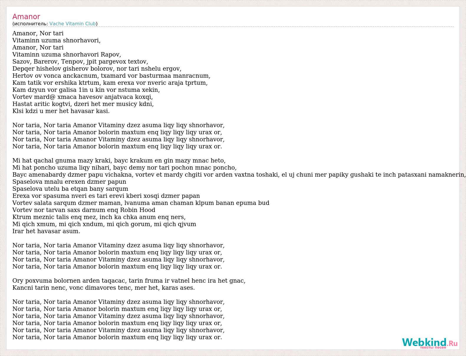 Amanor, Nor tari Vitaminn uzuma shnorhavori, Amanor, Nor tari Vitaminn uzuma shnorhavori Rapov, Sazov, Barerov, Tenpov, jpit pargevox textov, Depqer hishelov gisherov bolorov, nor tari nshelu ergov, Hertov ov vonca anckacnum, txamard vor basturmaa manracnum, Kam tatik vor ershika ktrtum, kam erexa vor nveric araja tprtum, Kam dzyun vor galisa 1in u kin vor nstuma xekin, Vortev mard@ xmaca havesov anjatvaca koxqi, Hastat aritic kogtvi, dzeri het mer musicy kdni, Klsi kdzi u mer het havasar kasi. Nor taria, Nor taria Amanor Vitaminy dzez asuma liqy liqy shnorhavor, Nor taria, Nor taria Amanor bolorin maxtum enq liqy liqy liqy urax or, Nor taria, Nor taria Amanor Vitaminy dzez asuma liqy liqy shnorhavor, Nor taria, Nor taria Amanor bolorin maxtum enq liqy liqy liqy urax or. Mi hat qachal gnuma mazy kraki, bayc krakum en gin mazy mnac heto, Mi hat poncho uzuma liqy nihari, bayc demy nor tari pochon mnac poncho, Bayc amenabardy dzmer papu vichakna, vortev et mardy chgiti vor arden vaxtna toshaki, el uj chuni mer papiky gushaki te inch patasxani namaknerin, Spaselova mnalu erexen dzmer papun Spaselova utelu ba etqan bany sarqum Erexa vor spasuma nveri es tari erevi kberi xosqi dzmer papan Vortev salata sarqum dzmer maman, lvanuma aman chaman klpum banan epuma bud Vortev nor tarvan saxs darnum enq Robin Hood Ktrum meznic talis enq mez, inch ka chka anum enq ners, Mi qich xmum, mi qich xndum, mi qich gorum, mi qich qjvum Irar het havasar asum. Nor taria, Nor taria Amanor Vitaminy dzez asuma liqy liqy shnorhavor, Nor taria, Nor taria Amanor bolorin maxtum enq liqy liqy liqy urax or, Nor taria, Nor taria Amanor Vitaminy dzez asuma liqy liqy shnorhavor, Nor taria, Nor taria Amanor bolorin maxtum enq liqy liqy liqy urax or. Ory poxvuma bolornen arden taqacac, tarin fruma ir vatnel henc ira het gnac, Kancni tarin nenc, vonc dimavores tenc, mer het, karas ases. Nor taria, Nor taria Amanor Vitaminy dzez asuma liqy liqy shnorhavor, Nor taria, Nor taria Amanor bolorin maxtum enq liqy liqy liqy urax or, Nor taria, Nor taria Amanor Vitaminy dzez asuma liqy liqy shnorhavor, Nor taria, Nor taria Amanor bolorin maxtum enq liqy liqy liqy urax or, Nor taria, Nor taria Amanor Vitaminy dzez asuma liqy liqy shnorhavor, Nor taria, Nor taria Amanor bolorin maxtum enq liqy liqy liqy urax or.