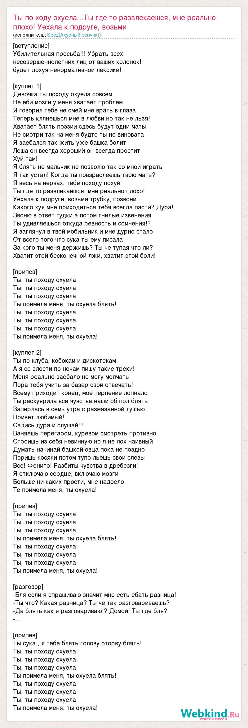 [вступление] Убилительная просьба!!! Убрать всех несовершеннолетних лиц от ваших колонок! будет дохуя ненормативной лексики! [куплет 1] Девочка ты походу охуела совсем Не еби мозги у меня хватает проблем Я говорил тебе не смей мне врать в глаза Теперь клянешься мне в любви но так не льзя! Хватает блять поэзии сдесь будут одни маты Не смотри так на меня будто ты не виновата Я заебался так жить уже башка болит Леша он всегда хороший он всегда простит Хуй там! Я блять не мальчик не позволю так со мной играть Я так устал! Когда ты повзраслеешь твою мать? Я весь на нервах, тебе походу похуй Ты где то развлекаешся, мне реально плохо! Уехала к подруге, возьми трубку, позвони Какого хуя мне приходиться тебя всегда пасти? Дура! Звоню в ответ гудки а потом гнилые извенения Ты удивляешься откуда ревность и сомнения!? Я заглянул в твой мобильник и мне дурно стало От всего того что сука ты ему писала За кого ты меня держишь? Ты че тупая что ли? Хватит этой бесконечной лжи, хватит этой боли! [припев] Ты, ты походу охуела Ты, ты походу охуела Ты, ты походу охуела Ты поимела меня, ты охуела блять! Ты, ты походу охуела Ты, ты походу охуела Ты, ты походу охуела Ты поимела меня, ты охуела! [куплет 2] Ты по клуба, кобокам и дискотекам А я со злости по ночам пишу такие треки! Меня реально заебало не могу молчать Пора тебя учить за базар свой отвечать! Всему приходит конец, мое терпение лопнало Ты расхуярила все чувства наши об пол блять Заперлась в семь утра с размазанной тушью Привет любимый! Садись дура и слушай!!! Ваняешь перегаром, куревом смотреть противно Строишь из себя невинную но я не лох наивный Думать начинай башкой овца пока не поздно Поришь косяки потом тупо льешь свои слезы Все! Фенито! Разбиты чувства в дребезги! Я отключаю сердце, включаю мозги Больше ни каких прости, мне надоело Те поимела меня, ты охуела! [припев] Ты, ты походу охуела Ты, ты походу охуела Ты, ты походу охуела Ты поимела меня, ты охуела блять! Ты, ты походу охуела Ты, ты походу охуела Ты, ты походу охуела Ты поимела меня, ты охуела! [разговор] -Бля если я спрашиваю значит мне есть ебать разница! -Ты что? Какая разница? Ты че так разговариваешь? -Да блять как я разговариваю!? Домой! Ты где бля? -... [припев] Ты сука , я тебе блять голову оторву блять! Ты, ты походу охуела Ты, ты походу охуела Ты, ты походу охуела Ты поимела меня, ты охуела блять! Ты, ты походу охуела Ты, ты походу охуела Ты, ты походу охуела Ты поимела меня, ты охуела!