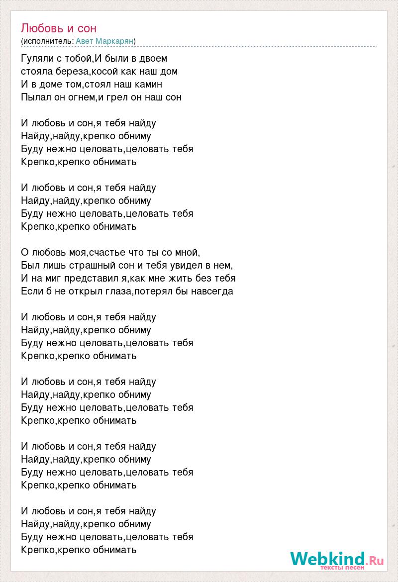 Гуляли с тобой,И были в двоем стояла береза,косой как наш дом И в доме том,стоял наш камин Пылал он огнем,и грел он наш сон И любовь и сон,я тебя найду Найду,найду,крепко обниму Буду нежно целовать,целовать тебя Крепко,крепко обнимать И любовь и сон,я тебя найду Найду,найду,крепко обниму Буду нежно целовать,целовать тебя Крепко,крепко обнимать О любовь моя,счастье что ты со мной, Был лишь страшный сон и тебя увидел в нем, И на миг представил я,как мне жить без тебя Если б не открыл глаза,потерял бы навсегда И любовь и сон,я тебя найду Найду,найду,крепко обниму Буду нежно целовать,целовать тебя Крепко,крепко обнимать И любовь и сон,я тебя найду Найду,найду,крепко обниму Буду нежно целовать,целовать тебя Крепко,крепко обнимать И любовь и сон,я тебя найду Найду,найду,крепко обниму Буду нежно целовать,целовать тебя Крепко,крепко обнимать И любовь и сон,я тебя найду Найду,найду,крепко обниму Буду нежно целовать,целовать тебя Крепко,крепко обнимать