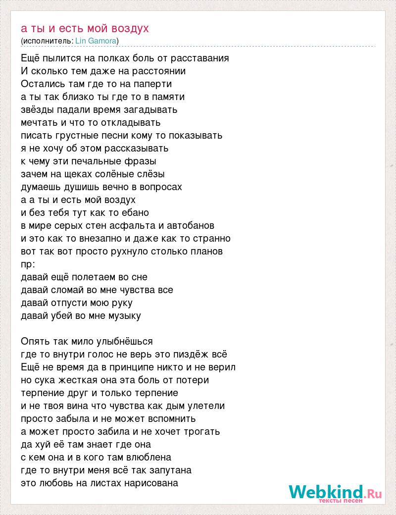 Ещё пылится на полках боль от расставания И сколько тем даже на расстоянии Остались там где то на паперти а ты так близко ты где то в памяти звёзды падали время загадывать мечтать и что то откладывать писать грустные песни кому то показывать я не хочу об этом рассказывать к чему эти печальные фразы зачем на щеках солёные слёзы думаешь душишь вечно в вопросах а а ты и есть мой воздух и без тебя тут как то ебано в мире серых стен асфальта и автобанов и это как то внезапно и даже как то странно вот так вот просто рухнуло столько планов пр: давай ещё полетаем во сне давай сломай во мне чувства все давай отпусти мою руку давай убей во мне музыку Опять так мило улыбнёшься где то внутри голос не верь это пиздёж всё Ещё не время да в принципе никто и не верил но сука жесткая она эта боль от потери терпение друг и только терпение и не твоя вина что чувства как дым улетели просто забыла и не может вспомнить а может просто забила и не хочет трогать да хуй её там знает где она с кем она и в кого там влюблена где то внутри меня всё так запутана это любовь на листах нарисована
