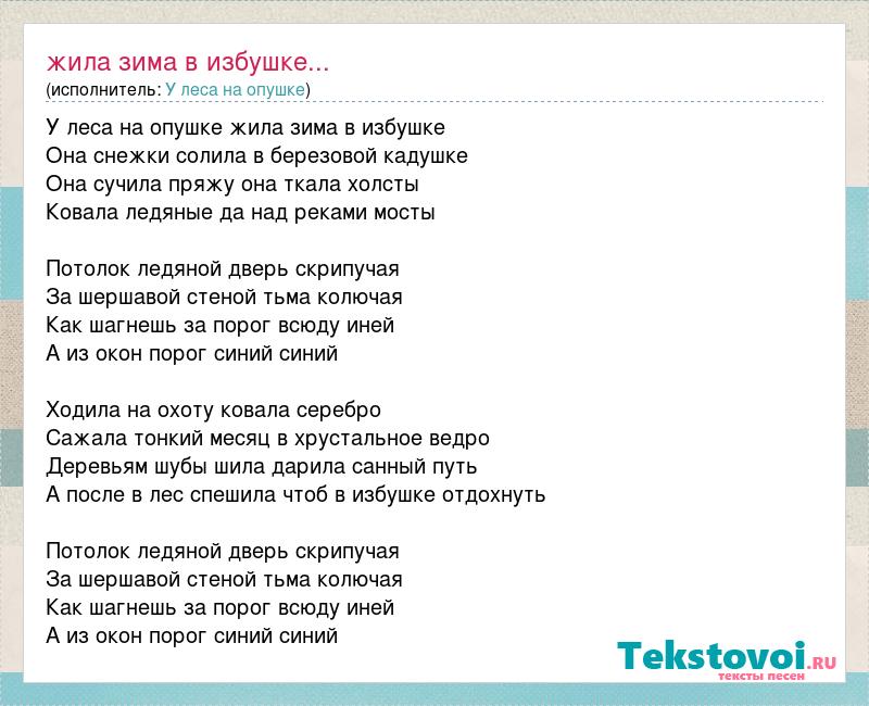У леса на опушке жила зима в избушке Она снежки солила в березовой кадушке Она сучила пряжу она ткала холсты Ковала ледяные да над реками мосты Потолок ледяной дверь скрипучая За шершавой стеной тьма колючая Как шагнешь за порог всюду иней А из окон порог синий синий Ходила на охоту ковала серебро Сажала тонкий месяц в хрустальное ведро Деревьям шубы шила дарила санный путь А после в лес спешила чтоб в избушке отдохнуть Потолок ледяной дверь скрипучая За шершавой стеной тьма колючая Как шагнешь за порог всюду иней А из окон порог синий синий