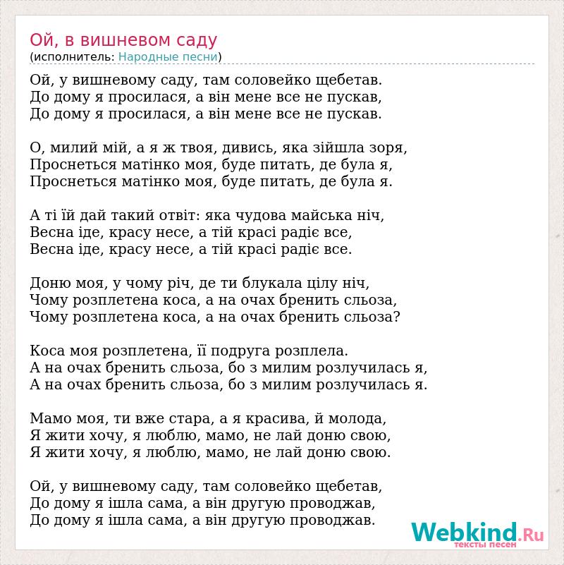 Ой, у вишневому саду, там соловейко щебетав. До дому я просилася, а він мене все не пускав, До дому я просилася, а він мене все не пускав. О, милий мій, а я ж твоя, дивись, яка зійшла зоря, Проснеться матінко моя, буде питать, де була я, Проснеться матінко моя, буде питать, де була я. А ті їй дай такий отвіт: яка чудова майська ніч, Весна іде, красу несе, а тій красі радіє все, Весна іде, красу несе, а тій красі радіє все. Доню моя, у чому річ, де ти блукала цілу ніч, Чому розплетена коса, а на очах бренить сльоза, Чому розплетена коса, а на очах бренить сльоза? Коса моя розплетена, її подруга розплела. А на очах бренить сльоза, бо з милим розлучилась я, А на очах бренить сльоза, бо з милим розлучилась я. Мамо моя, ти вже стара, а я красива, й молода, Я жити хочу, я люблю, мамо, не лай доню свою, Я жити хочу, я люблю, мамо, не лай доню свою. Ой, у вишневому саду, там соловейко щебетав, До дому я ішла сама, а він другую проводжав, До дому я ішла сама, а він другую проводжав.