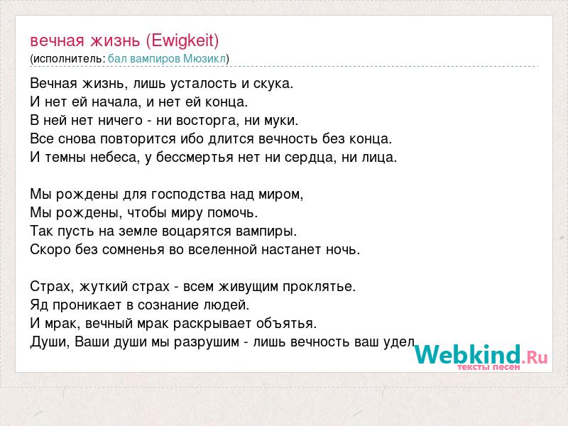 Вечная жизнь, лишь усталость и скука. И нет ей начала, и нет ей конца. В ней нет ничего - ни восторга, ни муки. Все снова повторится ибо длится вечность без конца. И темны небеса, у бессмертья нет ни сердца, ни лица. Мы рождены для господства над миром, Мы рождены, чтобы миру помочь. Так пусть на земле воцарятся вампиры. Скоро без сомненья во вселенной настанет ночь. Страх, жуткий страх - всем живущим проклятье. Яд проникает в сознание людей. И мрак, вечный мрак раскрывает объятья. Души, Ваши души мы разрушим - лишь вечность ваш удел.