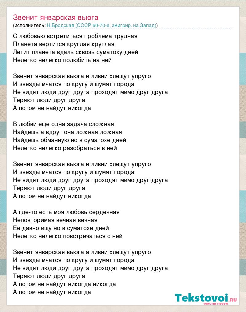 С любовью встретиться проблема трудная Планета вертится круглая круглая Летит планета вдаль сквозь суматоху дней Нелегко нелегко полюбить на ней Звенит январская вьюга и ливни хлещут упруго И звезды мчатся по кругу и шумят города Не видят люди друг друга проходят мимо друг друга Теряют люди друг друга А потом не найдут никогда В любви еще одна задача сложная Найдешь а вдруг она ложная ложная Найдешь обманную но в суматохе дней Нелегко нелегко разобраться в ней Звенит январская вьюга и ливни хлещут упруго И звезды мчатся по кругу и шумят города Не видят люди друг друга проходят мимо друг друга Теряют люди друг друга А потом не найдут никогда А где-то есть моя любовь сердечная Неповторимая вечная вечная Ее давно ищу но в суматохе дней Нелегко нелегко повстречаться с ней Звенит январская вьюга а ливни хлещут упруго И звезды мчатся по кругу и шумят города Не видят люди друг друга проходят мимо друг друга Теряют люди друг друга А потом не найдут никогда никогда А потом не найдут никогда