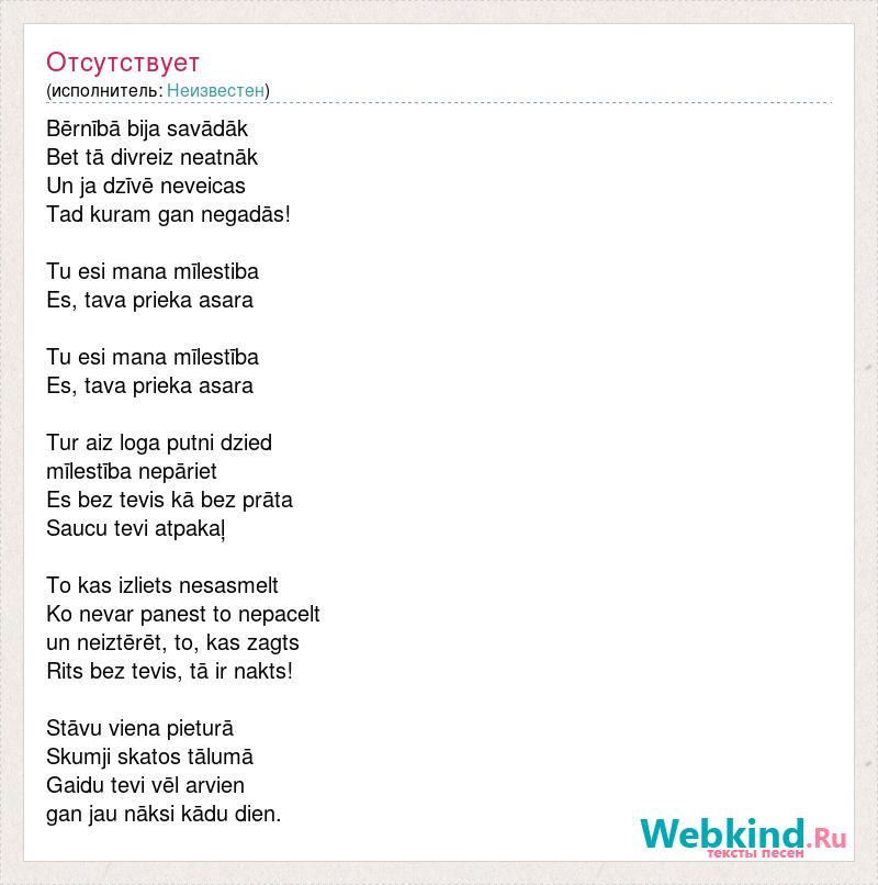 Bērnībā bija savādāk Bet tā divreiz neatnāk Un ja dzīvē neveicas Tad kuram gan negadās! Tu esi mana mīlestiba Es, tava prieka asara Tu esi mana mīlestība Es, tava prieka asara Tur aiz loga putni dzied mīlestība nepāriet Es bez tevis kā bez prāta Saucu tevi atpakaļ To kas izliets nesasmelt Ko nevar panest to nepacelt un neiztērēt, to, kas zagts Rits bez tevis, tā ir nakts! Stāvu viena pieturā Skumji skatos tālumā Gaidu tevi vēl arvien gan jau nāksi kādu dien.