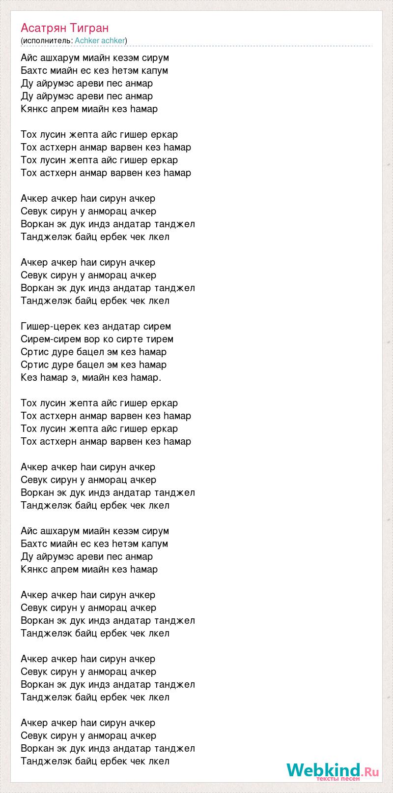 Айс ашхарум миайн кезэм сирум Бахтс миайн ес кез hетэм капум Ду айрумэс ареви пес анмар Ду айрумэс ареви пес анмар Кянкс апрем миайн кез hамар Тох лусин жепта айс гишер еркар Тох астхерн анмар варвен кез hамар Тох лусин жепта айс гишер еркар Тох астхерн анмар варвен кез hамар Ачкер ачкер hаи сирун ачкер Севук сирун у анморац ачкер Воркан эк дук индз андатар танджел Танджелэк байц ербек чек лкел Ачкер ачкер hаи сирун ачкер Севук сирун у анморац ачкер Воркан эк дук индз андатар танджел Танджелэк байц ербек чек лкел Гишер-церек кез андатар сирем Сирем-сирем вор ко сирте тирем Сртис дуре бацел эм кез hамар Сртис дуре бацел эм кез hамар Кез hамар э, миайн кез hамар. Тох лусин жепта айс гишер еркар Тох астхерн анмар варвен кез hамар Тох лусин жепта айс гишер еркар Тох астхерн анмар варвен кез hамар Ачкер ачкер hаи сирун ачкер Севук сирун у анморац ачкер Воркан эк дук индз андатар танджел Танджелэк байц ербек чек лкел Айс ашхарум миайн кезэм сирум Бахтс миайн ес кез hетэм капум Ду айрумэс ареви пес анмар Кянкс апрем миайн кез hамар Ачкер ачкер hаи сирун ачкер Севук сирун у анморац ачкер Воркан эк дук индз андатар танджел Танджелэк байц ербек чек лкел Ачкер ачкер hаи сирун ачкер Севук сирун у анморац ачкер Воркан эк дук индз андатар танджел Танджелэк байц ербек чек лкел Ачкер ачкер hаи сирун ачкер Севук сирун у анморац ачкер Воркан эк дук индз андатар танджел Танджелэк байц ербек чек лкел
