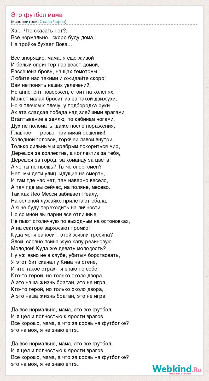 Ха... Что сказать нет?.. Все нормально.. скоро буду дома, На тройке бухает Вова... Все впорядке, мама, я еще живой И белый спринтер нас везет домой, Рассечена бровь, на щах гемотомы, Любите нас такими и ожидайте скоро! Вам не понять наших увлечений, Но аппонент повержен, стоит на коленях, Может малая бросит из-за такой движухи, Но я плечом к плечу, у подбородка руки. Ах эта сладкая победа над злейшими врагами, Втаптывание в землю, по кабинам ногами, Дух не поломать, даже после поражения, Главное - трезво, принимай решения! Холодной головой, горячей лавой внутри, Только сильным и храбрым покориться мир, Дерешся за коллектив, а коллектив за тебя, Дерешся за город, за команду за цвета! А че ты не пьешь? Ты че спортсмен? Нет, мы дети улиц, идущие на смерть, И там где нас нет, там наверно весело, А там где мы сейчас, на поляне, месево. Так как Лео Месси забивает Реалу, На зеленой лужайке прилетают ебала, А я не буду переходить на личности, Но со мной вы парни все отличные. Не пьют столичную по выходным на остоновках, А на секторе заряжают громко! Куда меня заносит, этой жизни тресина? Злой, словно псина жую капу резиновую. Молодой! Куда же девать молодость? Ну уж явно не в клубе, убитым борствовать, Я этот бит скачал у Кима на стене, И что такое страх - я знаю по себе! Кто-то герой, но только около двора, А это наша жизнь братан, это не игра. Кто-то герой, но только около двора, А это наша жизнь братан, это не игра. Да все нормально, мама, это же футбол, И я цел и полностью к ярости врагов. Все хорошо, мама, а что за кровь на футболке? это на моя, я не знаю ептэ.. Да все нормально, мама, это же футбол, И я цел и полностью к ярости врагов. Все хорошо, мама, а что за кровь на футболке? это на моя, я не знаю ептэ..