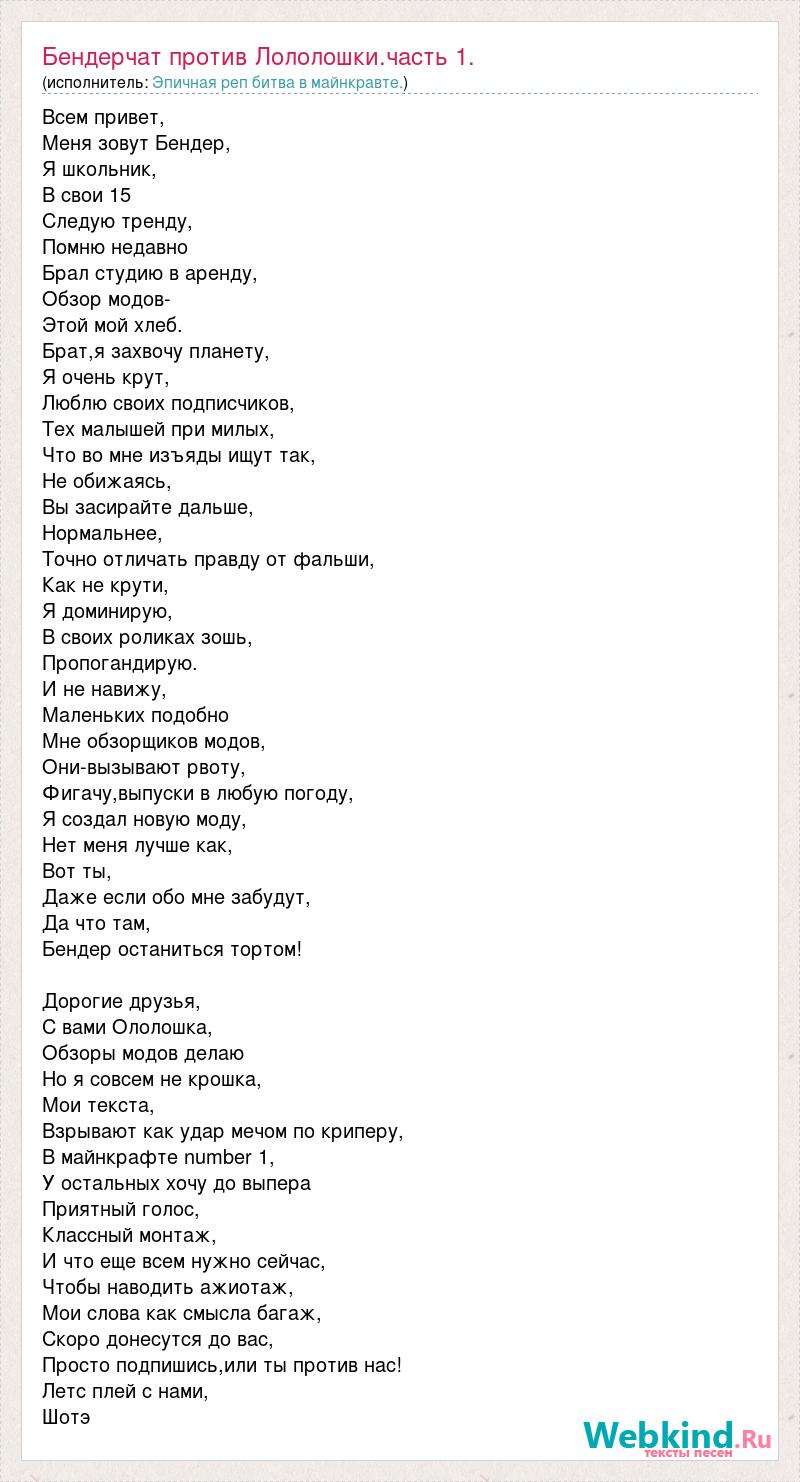 Всем привет, Меня зовут Бендер, Я школьник, В свои 15 Следую тренду, Помню недавно Брал студию в аренду, Обзор модов- Этой мой хлеб. Брат,я захвочу планету, Я очень крут, Люблю своих подписчиков, Тех малышей при милых, Что во мне изъяды ищут так, Не обижаясь, Вы засирайте дальше, Нормальнее, Точно отличать правду от фальши, Как не крути, Я доминирую, В своих роликах зошь, Пропогандирую. И не навижу, Маленьких подобно Мне обзорщиков модов, Они-вызывают рвоту, Фигачу,выпуски в любую погоду, Я создал новую моду, Нет меня лучше как, Вот ты, Даже если обо мне забудут, Да что там, Бендер останиться тортом! Дорогие друзья, С вами Ололошка, Обзоры модов делаю Но я совсем не крошка, Мои текста, Взрывают как удар мечом по криперу, В майнкрафте number 1, У остальных хочу до выпера Приятный голос, Классный монтаж, И что еще всем нужно сейчас, Чтобы наводить ажиотаж, Мои слова как смысла багаж, Скоро донесутся до вас, Просто подпишись,или ты против нас! Летс плей с нами, Шотэ