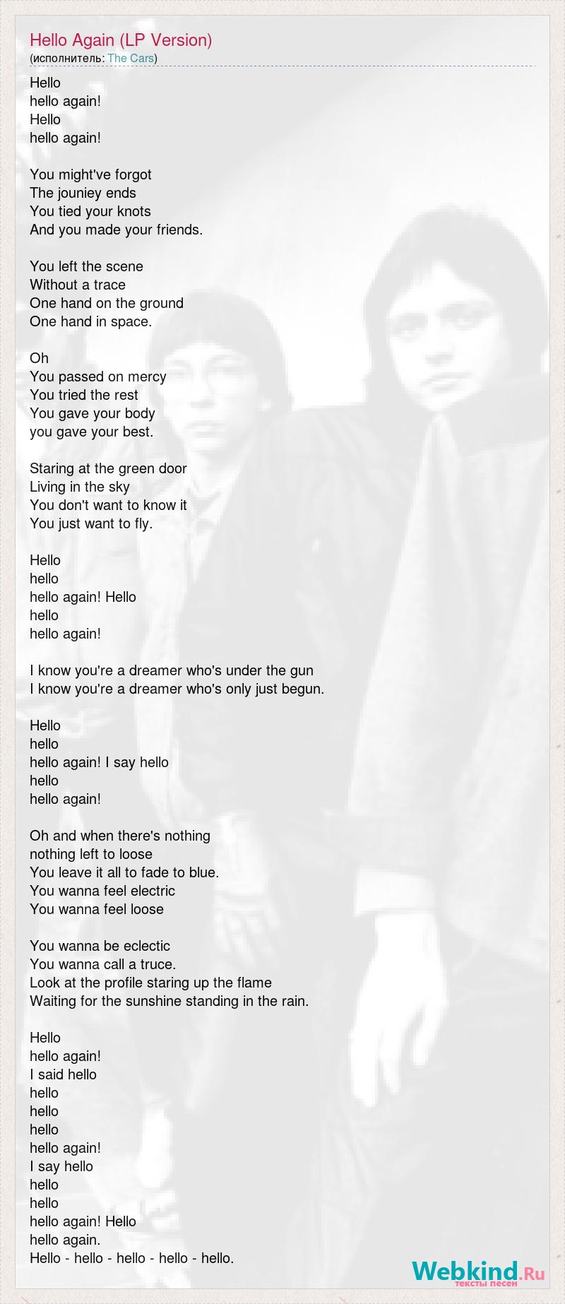 Hello hello again! Hello hello again! You might've forgot The jouniey ends You tied your knots And you made your friends. You left the scene Without a trace One hand on the ground One hand in space. Oh You passed on mercy You tried the rest You gave your body you gave your best. Staring at the green door Living in the sky You don't want to know it You just want to fly. Hello hello hello again! Hello hello hello again! I know you're a dreamer who's under the gun I know you're a dreamer who's only just begun. Hello hello hello again! I say hello hello hello again! Oh and when there's nothing nothing left to loose You leave it all to fade to blue. You wanna feel electric You wanna feel loose You wanna be eclectic You wanna call a truce. Look at the profile staring up the flame Waiting for the sunshine standing in the rain. Hello hello again! I said hello hello hello hello hello again! I say hello hello hello hello again! Hello hello again. Hello - hello - hello - hello - hello.
