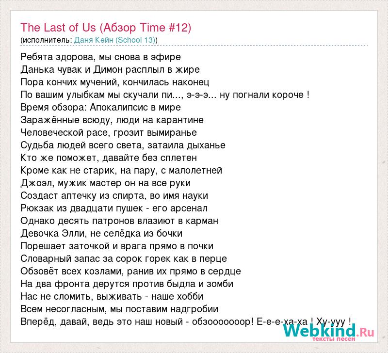 Ребята здорова, мы снова в эфире Данька чувак и Димон расплыл в жире Пора кончих мучений, кончилась наконец По вашим улыбкам мы скучали пи..., э-э-э... ну погнали короче ! Время обзора: Апокалипсис в мире Заражённые всюду, люди на карантине Человеческой расе, грозит вымиранье Судьба людей всего света, затаила дыханье Кто же поможет, давайте без сплетен Кроме как не старик, на пару, с малолетней Джоэл, мужик мастер он на все руки Создаст аптечку из спирта, во имя науки Рюкзак из двадцати пушек - его арсенал Однако десять патронов влазиют в карман Девочка Элли, не селёдка из бочки Порешает заточкой и врага прямо в почки Словарный запас за сорок горек как в перце Обзовёт всех козлами, ранив их прямо в сердце На два фронта дерутся против быдла и зомби Нас не сломить, выживать - наше хобби Всем несогласным, мы поставим надгробии Вперёд, давай, ведь это наш новый - обзооооооор! Е-е-е-ха-ха ! Ху-ууу !