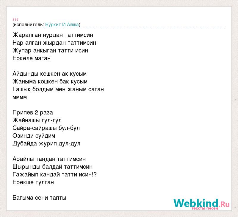 Жаралган нурдан таттимсин Нар алган жырдан таттимсин Жупар анкыган татти исин Еркеле маган Айдынды кешкен ак кусым Жаныма кошкен бак кусым Гашык болдым мен жаным саган мммм Припев 2 раза Жайнашы гул-гул Сайра-сайрашы бул-бул Озинди суйдим Дубайда журип дул-дул Арайлы тандан таттимсин Шырынды балдай таттимсин Гажайып кандай татти исин!? Ерекше тулган Багыма сени тапты