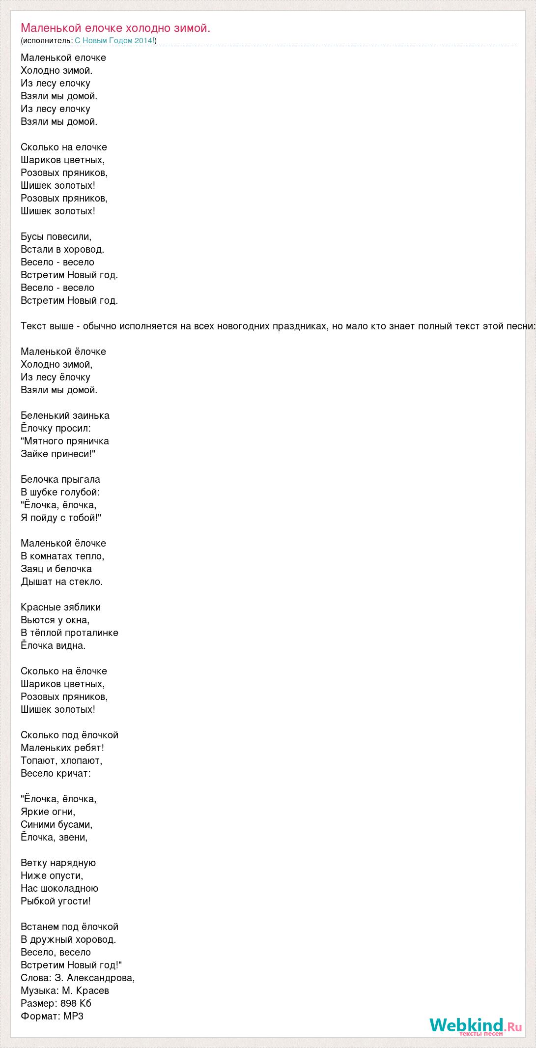 Маленькой елочке Холодно зимой. Из лесу елочку Взяли мы домой. Из лесу елочку Взяли мы домой. Сколько на елочке Шариков цветных, Розовых пряников, Шишек золотых! Розовых пряников, Шишек золотых! Бусы повесили, Встали в хоровод. Весело - весело Встретим Новый год. Весело - весело Встретим Новый год. Текст выше - обычно исполняется на всех новогодних праздниках, но мало кто знает полный текст этой песни: Маленькой ёлочке Холодно зимой, Из лесу ёлочку Взяли мы домой. Беленький заинька Ёлочку просил: "Мятного пряничка Зайке принеси!" Белочка прыгала В шубке голубой: "Ёлочка, ёлочка, Я пойду с тобой!" Маленькой ёлочке В комнатах тепло, Заяц и белочка Дышат на стекло. Красные зяблики Вьются у окна, В тёплой проталинке Ёлочка видна. Сколько на ёлочке Шариков цветных, Розовых пряников, Шишек золотых! Сколько под ёлочкой Маленьких ребят! Топают, хлопают, Весело кричат: "Ёлочка, ёлочка, Яркие огни, Синими бусами, Ёлочка, звени, Ветку нарядную Ниже опусти, Нас шоколадною Рыбкой угости! Встанем под ёлочкой В дружный хоровод. Весело, весело Встретим Новый год!" Слова: З. Александрова, Музыка: М. Красев Размер: 898 Кб Формат: MP3