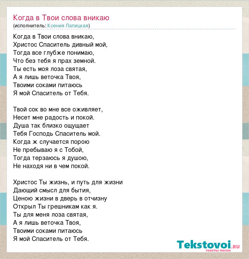 Когда в Твои слова вникаю, Христос Спаситель дивный мой, Тогда все глубже понимаю, Что без тебя я прах земной. Ты есть моя лоза святая, А я лишь веточка Твоя, Твоими соками питаюсь Я мой Спаситель от Тебя. Твой сок во мне все оживляет, Несет мне радость и покой. Душа так близко ощущает Тебя Господь Спаситель мой. Когда ж случается порою Не пребываю я с Тобой, Тогда терзаюсь я душою, Не находя ни в чем покой. Христос Ты жизнь, и путь для жизни Дающий смысл для бытия, Ценою жизни в дверь в отчизну Открыл Ты грешникам как я. Ты для меня лоза святая, А я лишь веточка Твоя, Твоими соками питаюсь Я мой Спаситель от Тебя.