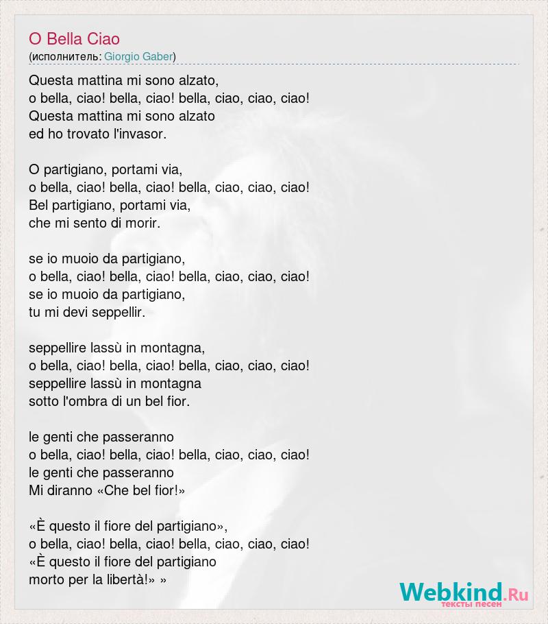 Questa mattina mi sono alzato, o bella, ciao! bella, ciao! bella, ciao, ciao, ciao! Questa mattina mi sono alzato ed ho trovato l'invasor. O partigiano, portami via, o bella, ciao! bella, ciao! bella, ciao, ciao, ciao! Bel partigiano, portami via, che mi sento di morir. se io muoio da partigiano, o bella, ciao! bella, ciao! bella, ciao, ciao, ciao! se io muoio da partigiano, tu mi devi seppellir. seppellire lassù in montagna, o bella, ciao! bella, ciao! bella, ciao, ciao, ciao! seppellire lassù in montagna sotto l'ombra di un bel fior. le genti che passeranno o bella, ciao! bella, ciao! bella, ciao, ciao, ciao! le genti che passeranno Mi diranno «Che bel fior!» «È questo il fiore del partigiano», o bella, ciao! bella, ciao! bella, ciao, ciao, ciao! «È questo il fiore del partigiano morto per la libertà!» »