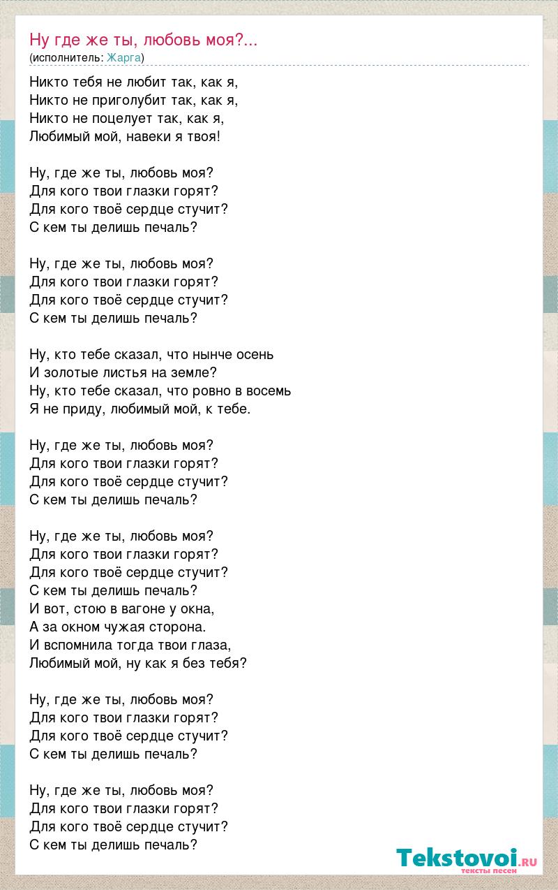 Никто тебя не любит так, как я, Никто не приголубит так, как я, Никто не поцелует так, как я, Любимый мой, навеки я твоя! Ну, где же ты, любовь моя? Для кого твои глазки горят? Для кого твоё сердце стучит? С кем ты делишь печаль? Ну, где же ты, любовь моя? Для кого твои глазки горят? Для кого твоё сердце стучит? С кем ты делишь печаль? Ну, кто тебе сказал, что нынче осень И золотые листья на земле? Ну, кто тебе сказал, что ровно в восемь Я не приду, любимый мой, к тебе. Ну, где же ты, любовь моя? Для кого твои глазки горят? Для кого твоё сердце стучит? С кем ты делишь печаль? Ну, где же ты, любовь моя? Для кого твои глазки горят? Для кого твоё сердце стучит? С кем ты делишь печаль? И вот, стою в вагоне у окна, А за окном чужая сторона. И вспомнила тогда твои глаза, Любимый мой, ну как я без тебя? Ну, где же ты, любовь моя? Для кого твои глазки горят? Для кого твоё сердце стучит? С кем ты делишь печаль? Ну, где же ты, любовь моя? Для кого твои глазки горят? Для кого твоё сердце стучит? С кем ты делишь печаль?