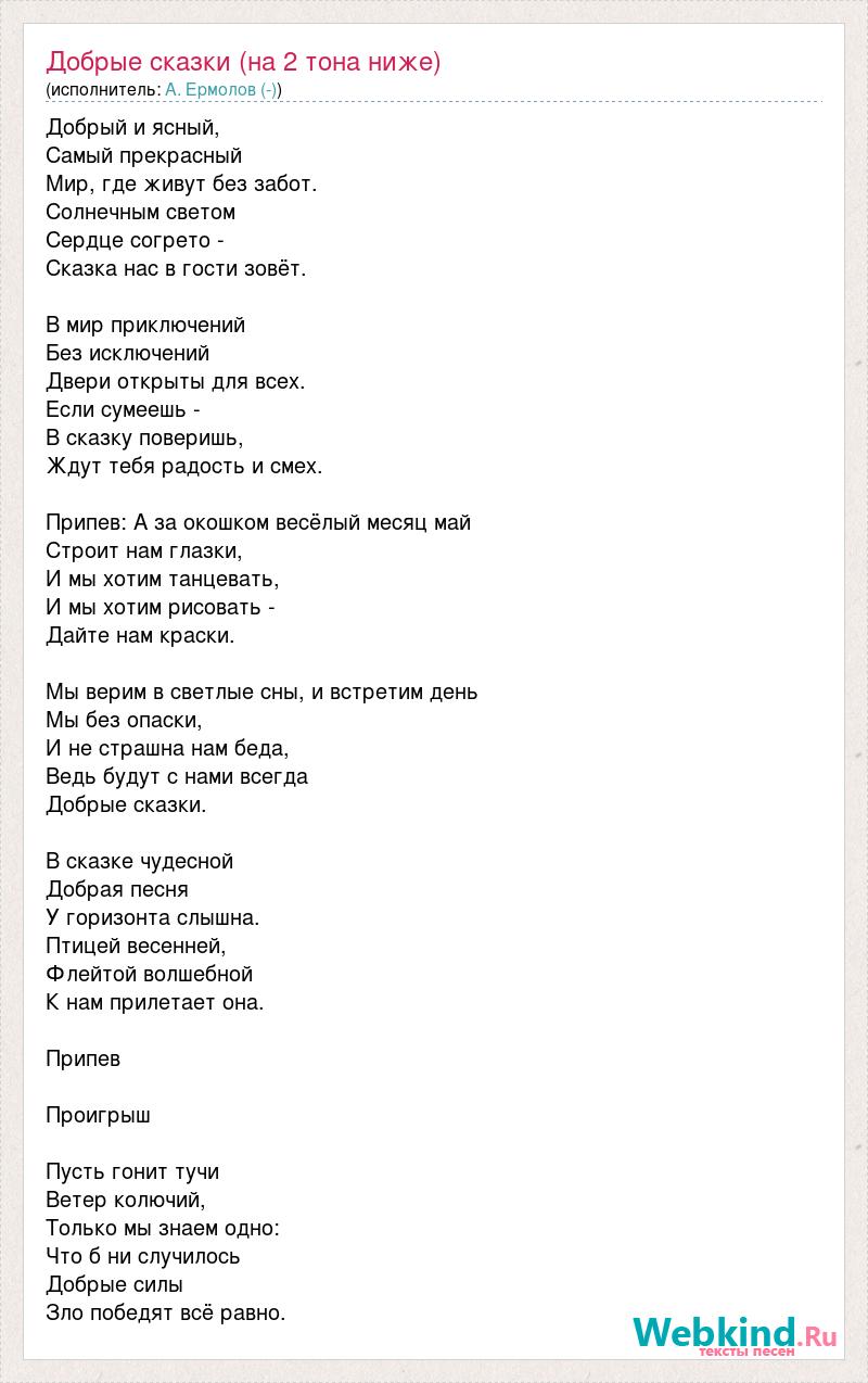 Добрый и ясный, Самый прекрасный Мир, где живут без забот. Солнечным светом Сердце согрето - Сказка нас в гости зовёт. В мир приключений Без исключений Двери открыты для всех. Если сумеешь - В сказку поверишь, Ждут тебя радость и смех. Припев: А за окошком весёлый месяц май Строит нам глазки, И мы хотим танцевать, И мы хотим рисовать - Дайте нам краски. Мы верим в светлые сны, и встретим день Мы без опаски, И не страшна нам беда, Ведь будут с нами всегда Добрые сказки. В сказке чудесной Добрая песня У горизонта слышна. Птицей весенней, Флейтой волшебной К нам прилетает она. Припев Проигрыш Пусть гонит тучи Ветер колючий, Только мы знаем одно: Что б ни случилось Добрые силы Зло победят всё равно.