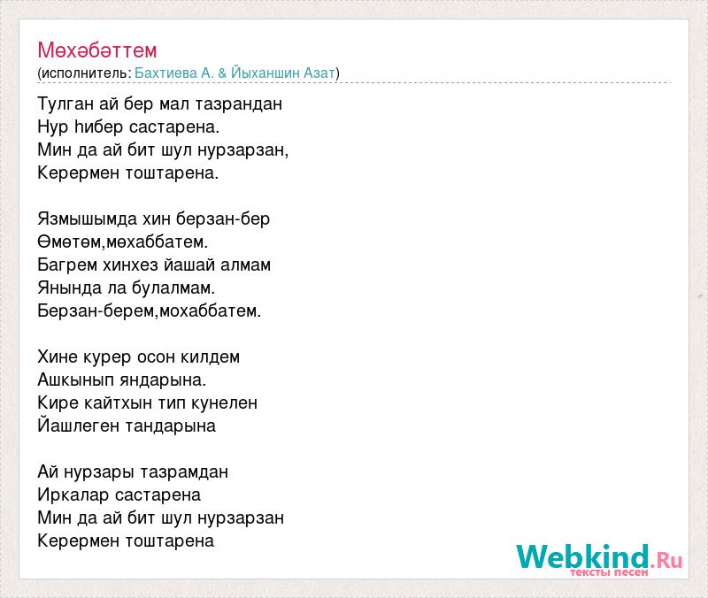 Тулган ай бер мал тазрандан Нур hибер састарена. Мин да ай бит шул нурзарзан, Керермен тоштарена. Язмышымда хин берзан-бер Өмөтөм,мөхаббатем. Багрем хинхез йашай алмам Янында ла булалмам. Берзан-берем,мохаббатем. Хине курер осон килдем Ашкынып яндарына. Кире кайтхын тип кунелен Йашлеген тандарына Ай нурзары тазрамдан Иркалар састарена Мин да ай бит шул нурзарзан Керермен тоштарена