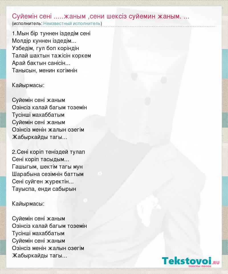 1.Мын бiр туннен iздедiм сенi Молдiр куннен iздедiм... Узбедiм, гул боп корiндiн Талай шахтын тажiсiн коркем Арай бактын санiсiн... Танысын, менин когiмнiн Кайырмасы: Суйемiн сенi жаным Озiнсiз калай багым тоземiн Тусiншi махаббатым Суйемiн сенi жаным Озiнсiз менiн жалын озегiм Жабыркайды тагы... 2.Сенi корiп тенiздей тулап Сенi корiп тасыдым... Гашыгым, шектiм тагы мун Шарабына сезiмнiн баттым Сенi суйген журектiн... Тауыспа, енди сабырын Кайырмасы: Суйемiн сенi жаным Озiнсiз калай багым тоземiн Тусiншi махаббатым Суйемiн сенi жаным Озiнсiз менiн жалын озегiм Жабыркайды тагы...