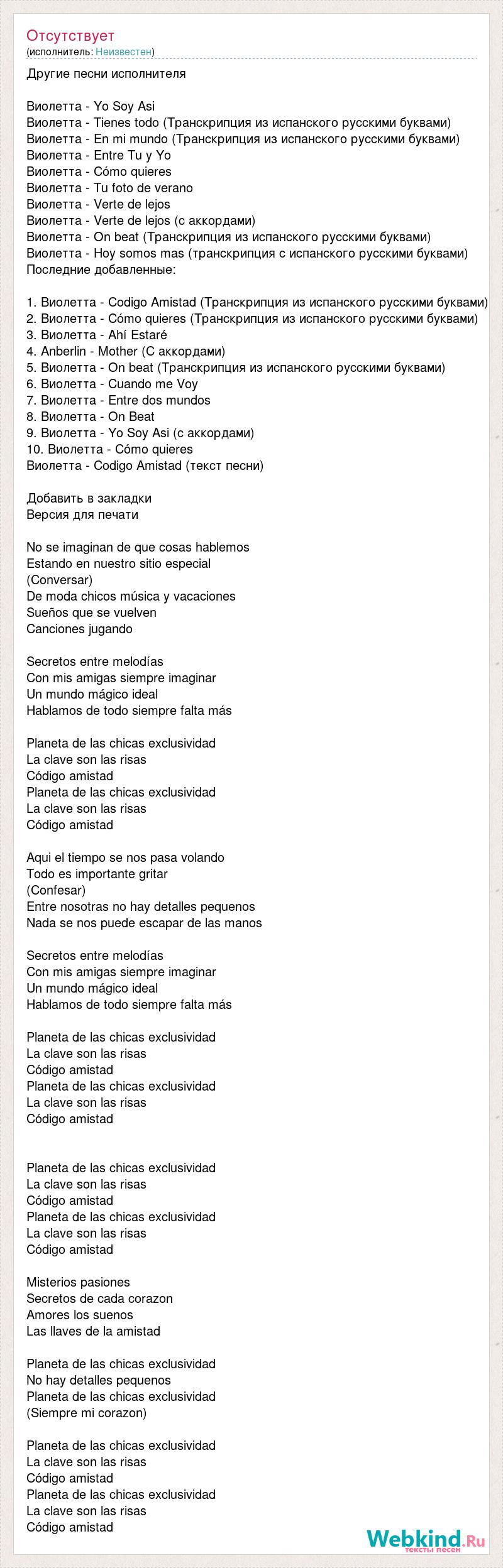 Другие песни исполнителя Виолетта - Yo Soy Asi Виолетта - Tienes todo (Транскрипция из испанского русскими буквами) Виолетта - En mi mundo (Транскрипция из испанского русскими буквами) Виолетта - Entre Tu y Yo Виолетта - Cómo quieres Виолетта - Tu foto de verano Виолетта - Verte de lejos Виолетта - Verte de lejos (с аккордами) Виолетта - On beat (Транскрипция из испанского русскими буквами) Виолетта - Hoy somos mas (транскрипция с испанского русскими буквами) Последние добавленные: 1. Виолетта - Codigo Amistad (Транскрипция из испанского русскими буквами) 2. Виолетта - Cómo quieres (Транскрипция из испанского русскими буквами) 3. Виолетта - Ahí Estaré 4. Anberlin - Mother (С аккордами) 5. Виолетта - On beat (Транскрипция из испанского русскими буквами) 6. Виолетта - Cuando me Voy 7. Виолетта - Entre dos mundos 8. Виолетта - On Beat 9. Виолетта - Yo Soy Asi (с аккордами) 10. Виолетта - Cómo quieres Виолетта - Codigo Amistad (текст песни) Добавить в закладки Версия для печати No se imaginan de que cosas hablemos Estando en nuestro sitio especial (Conversar) De moda chicos música y vacaciones Sueños que se vuelven Canciones jugando Secretos entre melodías Con mis amigas siempre imaginar Un mundo mágico ideal Hablamos de todo siempre falta más Planeta de las chicas exclusividad La clave son las risas Código amistad Planeta de las chicas exclusividad La clave son las risas Código amistad Aqui el tiempo se nos pasa volando Todo es importante gritar (Confesar) Entre nosotras no hay detalles pequenos Nada se nos puede escapar de las manos Secretos entre melodías Con mis amigas siempre imaginar Un mundo mágico ideal Hablamos de todo siempre falta más Planeta de las chicas exclusividad La clave son las risas Código amistad Planeta de las chicas exclusividad La clave son las risas Código amistad Planeta de las chicas exclusividad La clave son las risas Código amistad Planeta de las chicas exclusividad La clave son las risas Código amistad Misterios pasiones Secretos de cada corazon Amores los suenos Las llaves de la amistad Planeta de las chicas exclusividad No hay detalles pequenos Planeta de las chicas exclusividad (Siempre mi corazon) Planeta de las chicas exclusividad La clave son las risas Código amistad Planeta de las chicas exclusividad La clave son las risas Código amistad
