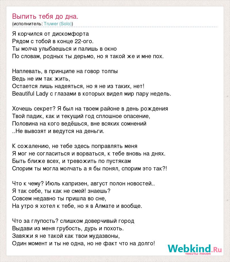 Я корчился от дискомфорта Рядом с тобой в конце 22-ого. Ты молча улыбаешься и палишь в окно По словам, родных ты дерьмо, но я такой же и мне пох. Наплевать, в принципе на говор толпы Ведь не им так жить, Остается лишь надеяться, но я не из таких, нет! Beautiful Lady с глазами в которых видел мир пару недель. Хочешь секрет? Я был на твоем районе в день рождения Твой падик, как и текущий год сплошное опасение, Половина на кого ведёшься, вне всяких сомнений ..Не вывозят и ведутся на деньги. К сожалению, не тебе здесь поправлять меня Я мог не согласиться и ворваться, к тебе вновь на днях. Быть ближе всех, и тревожить по пустякам Спорим ты могла молчать а я бы понял, спорим это так?! Что к чему? Июль капризен, август полон новостей.. Я так себе, ты как не смей! знаешь? Совсем недавно ты пришла во сне, На утро я хотел к тебе, но я в Алмате и вообще. Что за глупость? слишком доверчивый город Выдави из меня грубость, дурь и похоть. Завяжи я не такой как твои мудазвоны, Один момент и ты не одна, но не факт что на долго!