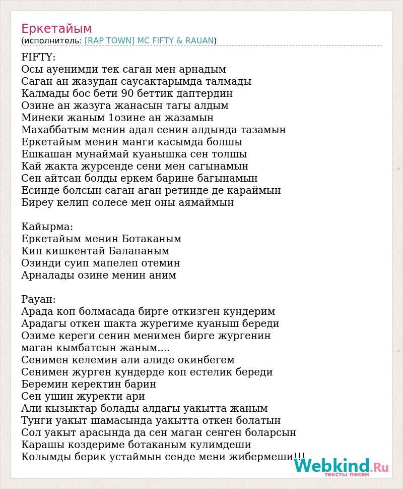 FIFTY: Осы ауенимди тек саган мен арнадым Саган ан жазудан саусактарымда талмады Калмады бос бети 90 беттик даптердин Озине ан жазуга жанасын тагы алдым Минеки жаным 1озине ан жазамын Махаббатым менин адал сенин алдында тазамын Еркетайым менин манги касымда болшы Ешкашан мунаймай куанышка сен толшы Кай жакта журсенде сени мен сагынамын Сен айтсан болды еркем барине багынамын Есинде болсын саган аган ретинде де караймын Биреу келип солесе мен оны аямаймын Кайырма: Еркетайым менин Ботаканым Кип кишкентай Балапаным Озинди суип мапелеп отемин Арналады озине менин аним Рауан: Арада коп болмасада бирге откизген кундерим Арадагы откен шакта журегиме куаныш береди Озиме кереги сенин менимен бирге жургенин маган кымбатсын жаным.... Сенимен келемин али алиде окинбегем Сенимен журген кундерде коп естелик береди Беремин керектин барин Сен ушин журекти ари Али кызыктар болады алдагы уакытта жаным Тунги уакыт шамасында уакытта откен болатын Сол уакыт арасында да сен маган сенген боларсын Карашы коздериме ботаканым кулимдеши Колымды берик устаймын сенде мени жибермеши!!!