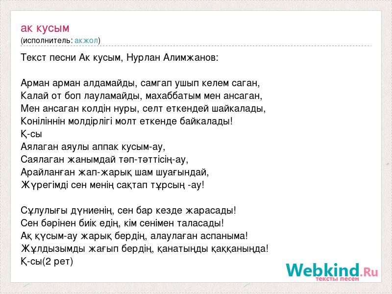 Текст песни Ак кусым, Нурлан Алимжанов: Арман арман алдамайды, самгап ушып келем саган, Калай от боп лауламайды, махаббатым мен ансаган, Мен ансаган колдін нуры, селт еткендей шайкалады, Коніліннін молдірлігі молт еткенде байкалады! Қ-сы Аялаган аяулы аппак кусым-ау, Саялаган жанымдай тәп-тәттісің-ау, Арайланған жап-жарық шам шуағындай, Жүрегімді сен менің сақтап тұрсың -ау! Сұлулығы дүниенің, сен бар кезде жарасады! Сен бәрінен биік едің, кім сенімен таласады! Ақ қүсым-ау жарық бердің, алаулаған аспаныма! Жұлдызымды жағып бердің, қанатыңды қаққаныңда! Қ-сы(2 рет)