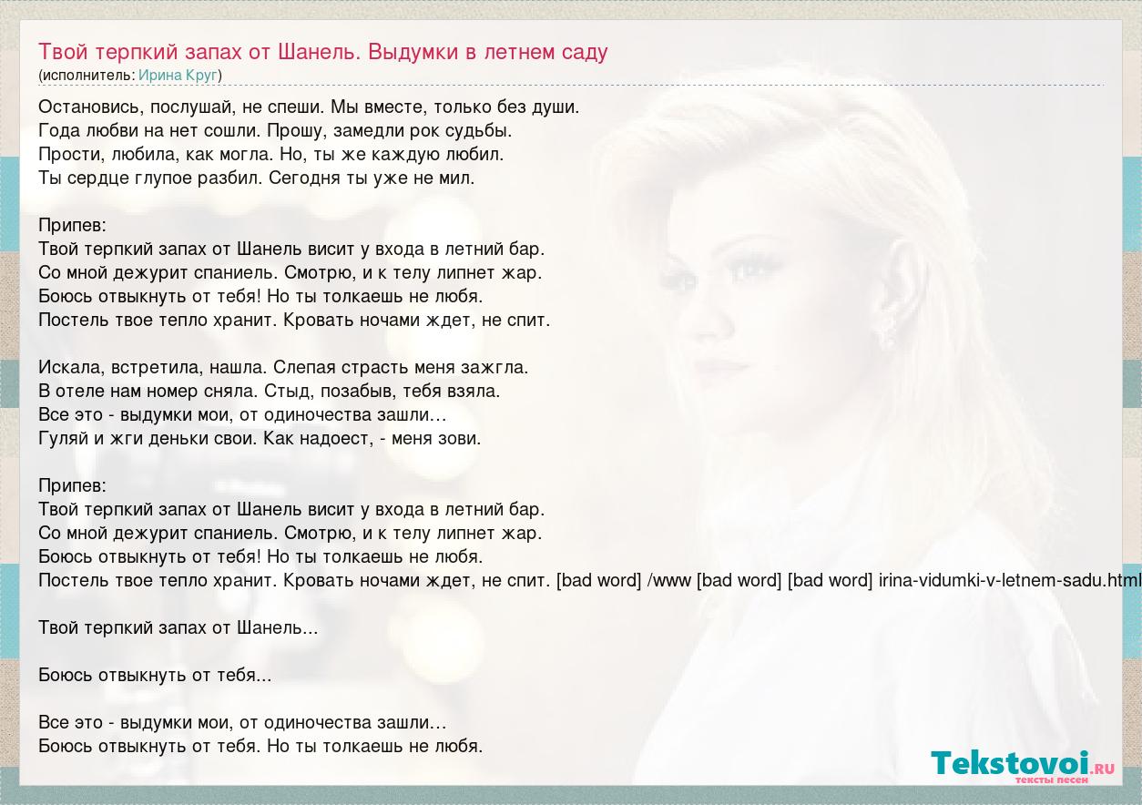 Остановись, послушай, не спеши. Мы вместе, только без души. Года любви на нет сошли. Прошу, замедли рок судьбы. Прости, любила, как могла. Но, ты же каждую любил. Ты сердце глупое разбил. Сегодня ты уже не мил. Припев: Твой терпкий запах от Шанель висит у входа в летний бар. Со мной дежурит спаниель. Смотрю, и к телу липнет жар. Боюсь отвыкнуть от тебя! Но ты толкаешь не любя. Постель твое тепло хранит. Кровать ночами ждет, не спит. Искала, встретила, нашла. Слепая страсть меня зажгла. В отеле нам номер сняла. Стыд, позабыв, тебя взяла. Все это - выдумки мои, от одиночества зашли… Гуляй и жги деньки свои. Как надоест, - меня зови. Припев: Твой терпкий запах от Шанель висит у входа в летний бар. Со мной дежурит спаниель. Смотрю, и к телу липнет жар. Боюсь отвыкнуть от тебя! Но ты толкаешь не любя. Постель твое тепло хранит. Кровать ночами ждет, не спит. [bad word] /www [bad word] krug-irina-vidumki-v-letnem-sadu.html Твой терпкий запах от Шанель... Боюсь отвыкнуть от тебя... Все это - выдумки мои, от одиночества зашли… Боюсь отвыкнуть от тебя. Но ты толкаешь не любя.