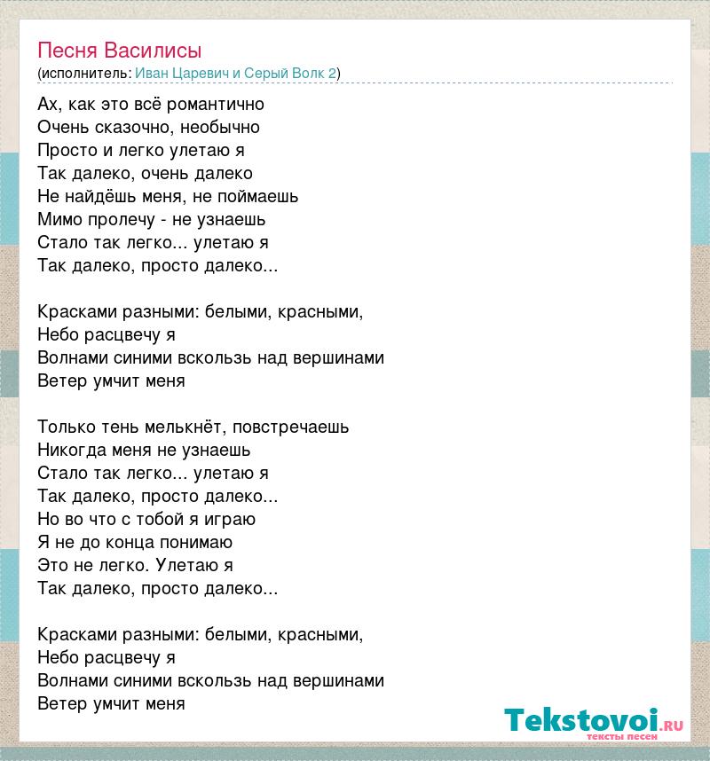 Ах, как это всё романтично Очень сказочно, необычно Просто и легко улетаю я Так далеко, очень далеко Не найдёшь меня, не поймаешь Мимо пролечу - не узнаешь Стало так легко... улетаю я Так далеко, просто далеко... Красками разными: белыми, красными, Небо расцвечу я Волнами синими вскользь над вершинами Ветер умчит меня Только тень мелькнёт, повстречаешь Никогда меня не узнаешь Стало так легко... улетаю я Так далеко, просто далеко... Но во что с тобой я играю Я не до конца понимаю Это не легко. Улетаю я Так далеко, просто далеко... Красками разными: белыми, красными, Небо расцвечу я Волнами синими вскользь над вершинами Ветер умчит меня