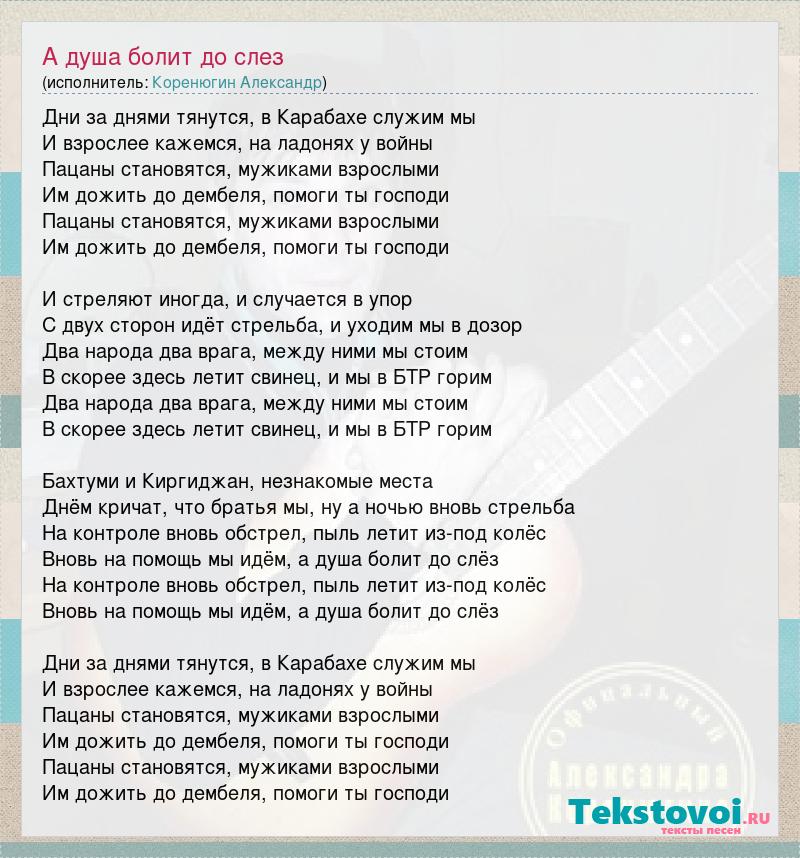 Дни за днями тянутся, в Карабахе служим мы И взрослее кажемся, на ладонях у войны Пацаны становятся, мужиками взрослыми Им дожить до дембеля, помоги ты господи Пацаны становятся, мужиками взрослыми Им дожить до дембеля, помоги ты господи И стреляют иногда, и случается в упор С двух сторон идёт стрельба, и уходим мы в дозор Два народа два врага, между ними мы стоим В скорее здесь летит свинец, и мы в БТР горим Два народа два врага, между ними мы стоим В скорее здесь летит свинец, и мы в БТР горим Бахтуми и Киргиджан, незнакомые места Днём кричат, что братья мы, ну а ночью вновь стрельба На контроле вновь обстрел, пыль летит из-под колёс Вновь на помощь мы идём, а душа болит до слёз На контроле вновь обстрел, пыль летит из-под колёс Вновь на помощь мы идём, а душа болит до слёз Дни за днями тянутся, в Карабахе служим мы И взрослее кажемся, на ладонях у войны Пацаны становятся, мужиками взрослыми Им дожить до дембеля, помоги ты господи Пацаны становятся, мужиками взрослыми Им дожить до дембеля, помоги ты господи