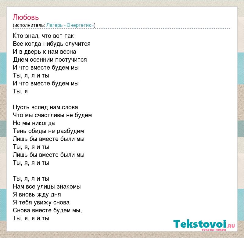 Кто знал, что вот так Все когда-нибудь случится И в дверь к нам весна Днем осенним постучится И что вместе будем мы Ты, я, я и ты И что вместе будем мы Ты, я Пусть вслед нам слова Что мы счастливы не будем Но мы никогда Тень обиды не разбудим Лишь бы вместе были мы Ты, я, я и ты Лишь бы вместе были мы Ты, я, я и ты Ты, я, я и ты Нам все улицы знакомы Я вновь жду дня Я тебя увижу снова Снова вместе будем мы, Ты, я, я и ты