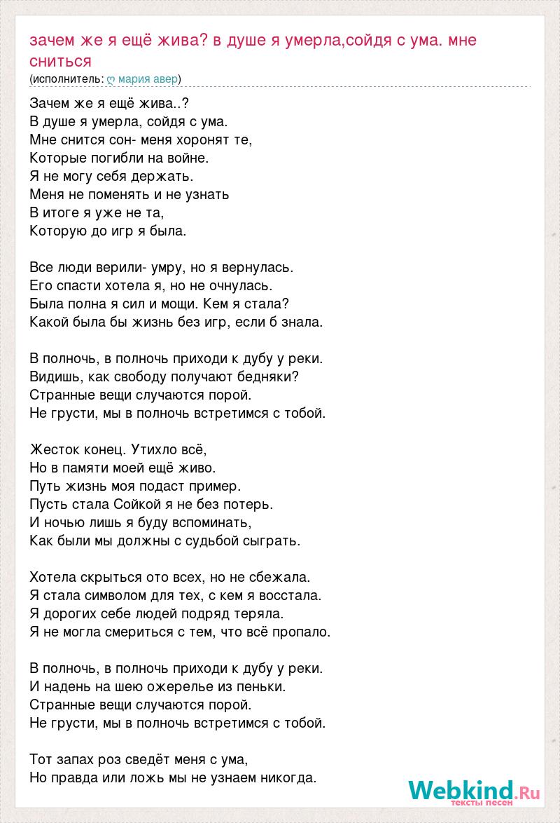 А как ты думаешь, о чем песня "Зачем же я ещё жива? в душе я умерла,сойдя с ума. мне сниться сон, меня" ?