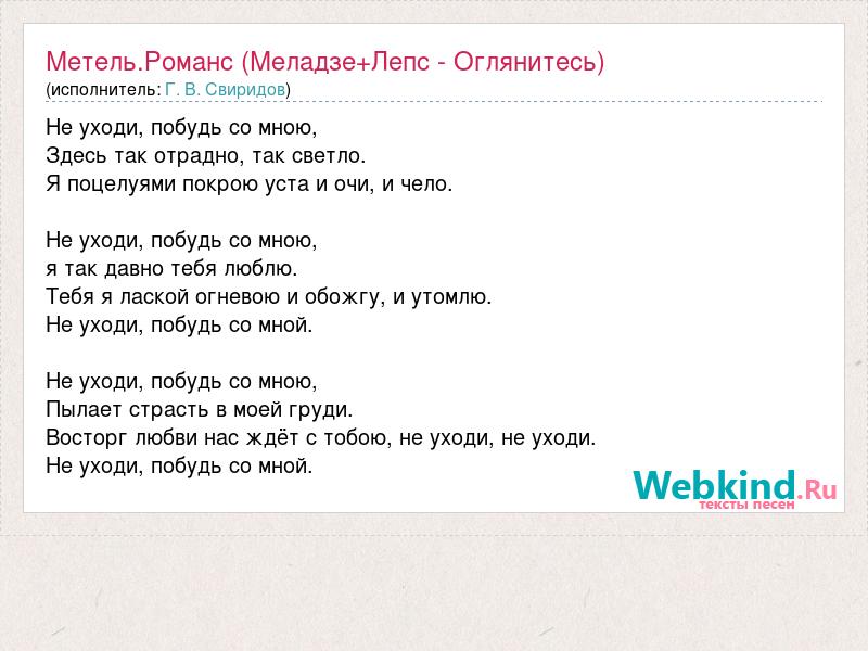 Не уходи, побудь со мною, Здесь так отрадно, так светло. Я поцелуями покрою уста и очи, и чело. Не уходи, побудь со мною, я так давно тебя люблю. Тебя я лаской огневою и обожгу, и утомлю. Не уходи, побудь со мной. Не уходи, побудь со мною, Пылает страсть в моей груди. Восторг любви нас ждёт с тобою, не уходи, не уходи. Не уходи, побудь со мной.