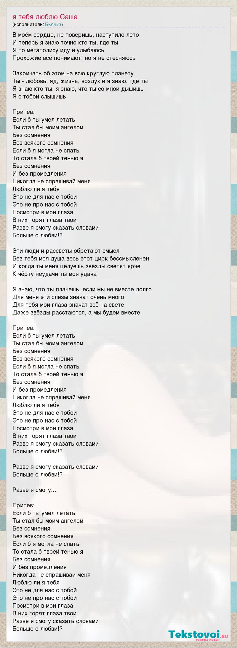 В моём сердце, не поверишь, наступило лето И теперь я знаю точно кто ты, где ты Я по мегаполису иду и улыбаюсь Прохожие всё понимают, но я не стесняюсь Закричать об этом на всю круглую планету Ты - любовь, яд, жизнь, воздух и я знаю, где ты Я знаю кто ты, я знаю, что ты со мной дышишь Я с тобой слышишь Припев: Если б ты умел летать Ты стал бы моим ангелом Без сомнения Без всякого сомнения Если б я могла не спать То стала б твоей тенью я Без сомнения И без промедления Никогда не спрашивай меня Люблю ли я тебя Это не для нас с тобой Это не про нас с тобой Посмотри в мои глаза В них горят глаза твои Разве я смогу сказать словами Больше о любви!? Эти люди и рассветы обретают смысл Без тебя моя душа весь этот цирк бессмысленен И когда ты меня целуешь звёзды светят ярче К чёрту неудачи ты моя удача Я знаю, что ты плачешь, если мы не вместе долго Для меня эти слёзы значат очень много Для тебя мои глаза значат всё на свете Даже звёзды расстаются, а мы будем вместе Припев: Если б ты умел летать Ты стал бы моим ангелом Без сомнения Без всякого сомнения Если б я могла не спать То стала б твоей тенью я Без сомнения И без промедления Никогда не спрашивай меня Люблю ли я тебя Это не для нас с тобой Это не про нас с тобой Посмотри в мои глаза В них горят глаза твои Разве я смогу сказать словами Больше о любви!? Разве я смогу сказать словами Больше о любви!? Разве я смогу... Припев: Если б ты умел летать Ты стал бы моим ангелом Без сомнения Без всякого сомнения Если б я могла не спать То стала б твоей тенью я Без сомнения И без промедления Никогда не спрашивай меня Люблю ли я тебя Это не для нас с тобой Это не про нас с тобой Посмотри в мои глаза В них горят глаза твои Разве я смогу сказать словами Больше о любви!?