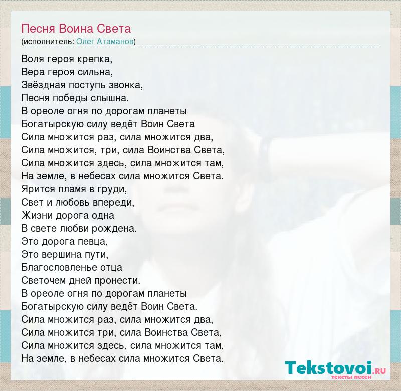 Воля героя крепка, Вера героя сильна, Звёздная поступь звонка, Песня победы слышна. В ореоле огня по дорогам планеты Богатырскую силу ведёт Воин Света Сила множится раз, сила множится два, Сила множится, три, сила Воинства Света, Сила множится здесь, сила множится там, На земле, в небесах сила множится Света. Ярится пламя в груди, Свет и любовь впереди, Жизни дорога одна В свете любви рождена. Это дорога певца, Это вершина пути, Благословленье отца Светочем дней пронести. В ореоле огня по дорогам планеты Богатырскую силу ведёт Воин Света. Сила множится раз, сила множится два, Сила множится три, сила Воинства Света, Сила множится здесь, сила множится там, На земле, в небесах сила множится Света.