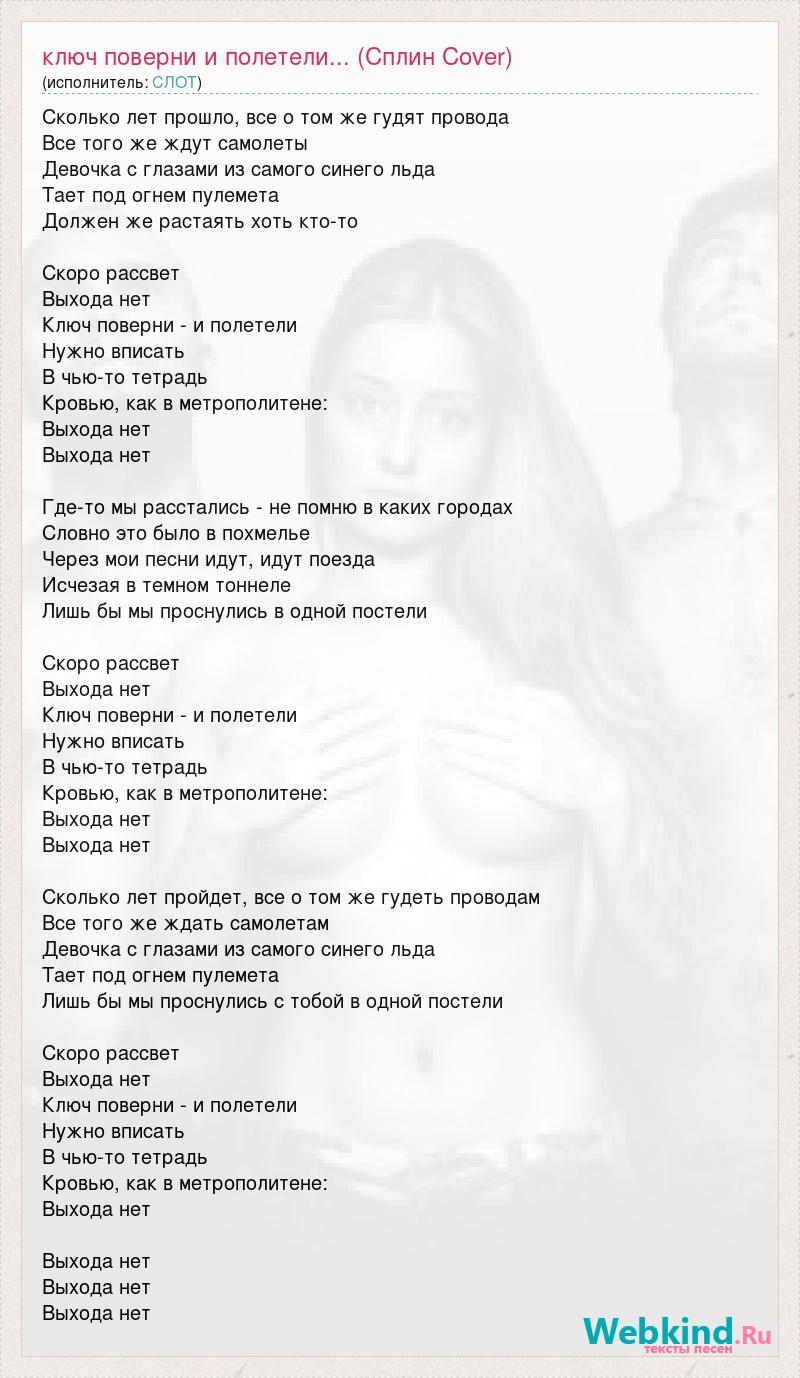 Сколько лет прошло, все о том же гудят провода Все того же ждут самолеты Девочка с глазами из самого синего льда Тает под огнем пулемета Должен же растаять хоть кто-то Скоро рассвет Выхода нет Ключ поверни - и полетели Нужно вписать В чью-то тетрадь Кровью, как в метрополитене: Выхода нет Выхода нет Где-то мы расстались - не помню в каких городах Словно это было в похмелье Через мои песни идут, идут поезда Исчезая в темном тоннеле Лишь бы мы проснулись в одной постели Скоро рассвет Выхода нет Ключ поверни - и полетели Нужно вписать В чью-то тетрадь Кровью, как в метрополитене: Выхода нет Выхода нет Сколько лет пройдет, все о том же гудеть проводам Все того же ждать самолетам Девочка с глазами из самого синего льда Тает под огнем пулемета Лишь бы мы проснулись с тобой в одной постели Скоро рассвет Выхода нет Ключ поверни - и полетели Нужно вписать В чью-то тетрадь Кровью, как в метрополитене: Выхода нет Выхода нет Выхода нет Выхода нет