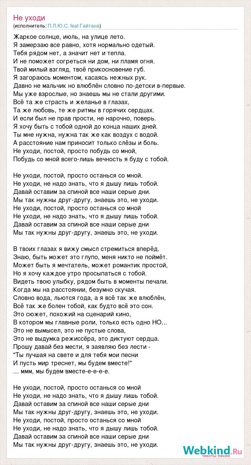 Жаркое солнце, июль, на улице лето. Я замерзаю все равно, хотя нормально одетый. Тебя рядом нет, а значит нет и тепла. И не поможет согреться ни дом, ни пламя огня. Твой милый взгляд, твоё прикосновение губ. Я загораюсь моментом, касаясь нежных рук. Давно не мальчик но влюблён словно по-детски в-первые. Мы уже взрослые, но знаешь мы не стали другими. Всё та же страсть и желанье в глазах, Та же любовь, те же ритмы в горячих сердцах. И если был не прав прости, не нарочно, поверь. Я хочу быть с тобой одной до конца наших дней. Ты мне нужна, нужна так же как воздух с водой. А расстояние нам приносит только слёзы и боль. Не уходи, постой, просто побудь со мной, Побудь со мной всего-лишь вечность я буду с тобой. Не уходи, постой, просто останься со мной. Не уходи, не надо знать, что я дышу лишь тобой. Давай оставим за спиной все наши серые дни. Мы так нужны друг-другу, знаешь это, не уходи. Не уходи, постой, просто останься со мной Не уходи, не надо знать, что я дышу лишь тобой. Давай оставим за спиной все наши серые дни Мы так нужны друг-другу, знаешь это, не уходи. В твоих глазах я вижу смысл стремиться вперёд. Знаю, быть может это глупо, меня никто не поймёт. Может быть я мечтатель, может романтик простой, Но я хочу каждое утро просыпаться с тобой. Видеть твою улыбку, рядом быть в моменты печали. Когда мы на расстоянии, безумно скучая. Словно вода, льются года, а я всё так же влюблён, Всё так же болен тобой, как будто всё это сон. Это сюжет, похожий на сценарий кино, В котором мы главные роли, только есть одно НО... Это не вымысел, это не пустые слова, Это не выдумка режиссёра, это диктуют сердца. Прошу давай без мести, я заявляю без лести - "Ты лучшая на свете и для тебя мои песни И пусть мир треснет, мы будем вместе!" ... ммм, мы будем вместе-е-е-е-е. Не уходи, постой, просто останься со мной Не уходи, не надо знать, что я дышу лишь тобой. Давай оставим за спиной все наши серые дни Мы так нужны друг-другу, знаешь это, не уходи. Не уходи, постой, просто останься со мной Не уходи, не надо знать, что я дышу лишь тобой. Давай оставим за спиной все наши серые дни Мы так нужны друг-другу, знаешь это, не уходи.