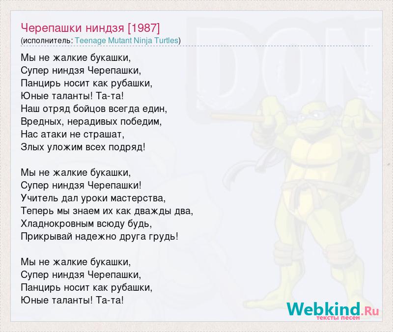 Мы не жалкие букашки, Супер ниндзя Черепашки, Панцирь носит как рубашки, Юные таланты! Та-та! Наш отряд бойцов всегда един, Вредных, нерадивых победим, Нас атаки не страшат, Злых уложим всех подряд! Мы не жалкие букашки, Супер ниндзя Черепашки! Учитель дал уроки мастерства, Теперь мы знаем их как дважды два, Хладнокровным всюду будь, Прикрывай надежно друга грудь! Мы не жалкие букашки, Супер ниндзя Черепашки, Панцирь носит как рубашки, Юные таланты! Та-та!