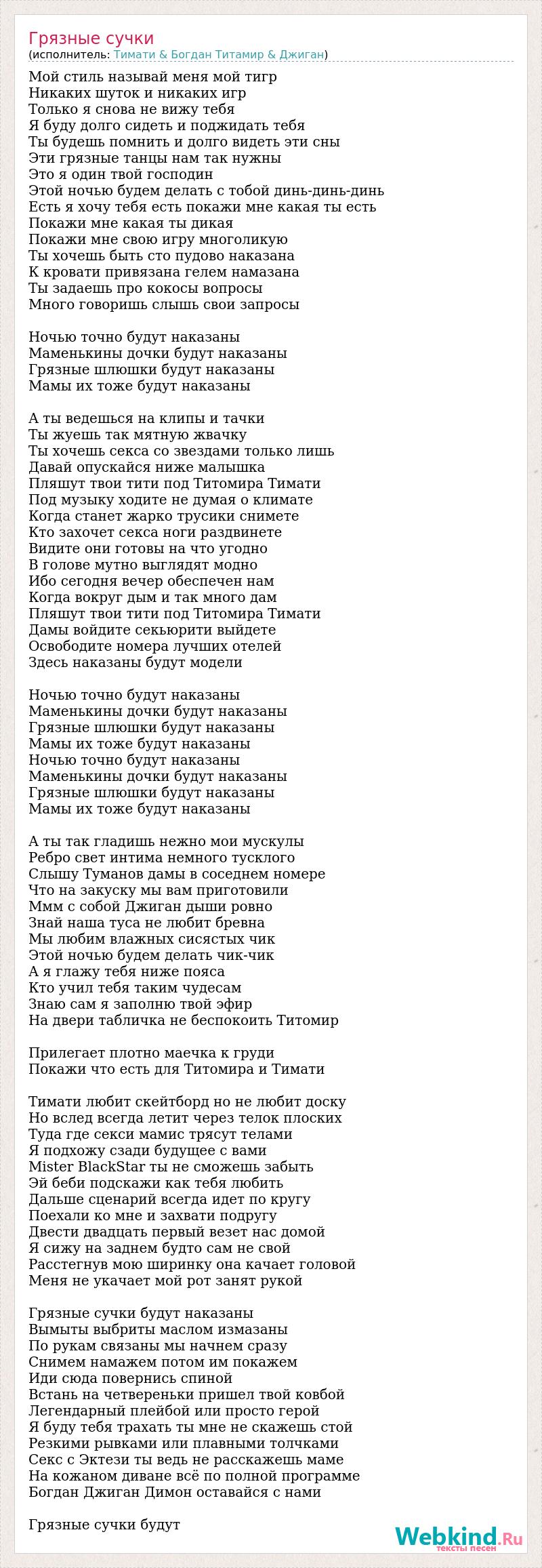 Мой стиль называй меня мой тигр Никаких шуток и никаких игр Только я снова не вижу тебя Я буду долго сидеть и поджидать тебя Ты будешь помнить и долго видеть эти сны Эти грязные танцы нам так нужны Это я один твой господин Этой ночью будем делать с тобой динь-динь-динь Есть я хочу тебя есть покажи мне какая ты есть Покажи мне какая ты дикая Покажи мне свою игру многоликую Ты хочешь быть сто пудово наказана К кровати привязана гелем намазана Ты задаешь про кокосы вопросы Много говоришь слышь свои запросы Ночью точно будут наказаны Маменькины дочки будут наказаны Грязные шлюшки будут наказаны Мамы их тоже будут наказаны А ты ведешься на клипы и тачки Ты жуешь так мятную жвачку Ты хочешь секса со звездами только лишь Давай опускайся ниже малышка Пляшут твои тити под Титомира Тимати Под музыку ходите не думая о климате Когда станет жарко трусики снимете Кто захочет секса ноги раздвинете Видите они готовы на что угодно В голове мутно выглядят модно Ибо сегодня вечер обеспечен нам Когда вокруг дым и так много дам Пляшут твои тити под Титомира Тимати Дамы войдите секьюрити выйдете Освободите номера лучших отелей Здесь наказаны будут модели Ночью точно будут наказаны Маменькины дочки будут наказаны Грязные шлюшки будут наказаны Мамы их тоже будут наказаны Ночью точно будут наказаны Маменькины дочки будут наказаны Грязные шлюшки будут наказаны Мамы их тоже будут наказаны А ты так гладишь нежно мои мускулы Ребро свет интима немного тусклого Слышу Туманов дамы в соседнем номере Что на закуску мы вам приготовили Ммм с собой Джиган дыши ровно Знай наша туса не любит бревна Мы любим влажных сисястых чик Этой ночью будем делать чик-чик А я глажу тебя ниже пояса Кто учил тебя таким чудесам Знаю сам я заполню твой эфир На двери табличка не беспокоить Титомир Прилегает плотно маечка к груди Покажи что есть для Титомира и Тимати Тимати любит скейтборд но не любит доску Но вслед всегда летит через телок плоских Туда где секси мамис трясут телами Я подхожу сзади будущее с вами Mister BlackStar ты не сможешь забыть Эй беби подскажи как тебя любить Дальше сценарий всегда идет по кругу Поехали ко мне и захвати подругу Двести двадцать первый везет нас домой Я сижу на заднем будто сам не свой Расстегнув мою ширинку она качает головой Меня не укачает мой рот занят рукой Грязные сучки будут наказаны Вымыты выбриты маслом измазаны По рукам связаны мы начнем сразу Снимем намажем потом им покажем Иди сюда повернись спиной Встань на четвереньки пришел твой ковбой Легендарный плейбой или просто герой Я буду тебя трахать ты мне не скажешь стой Резкими рывками или плавными толчками Секс с Эктези ты ведь не расскажешь маме На кожаном диване всё по полной программе Богдан Джиган Димон оставайся с нами Грязные сучки будут