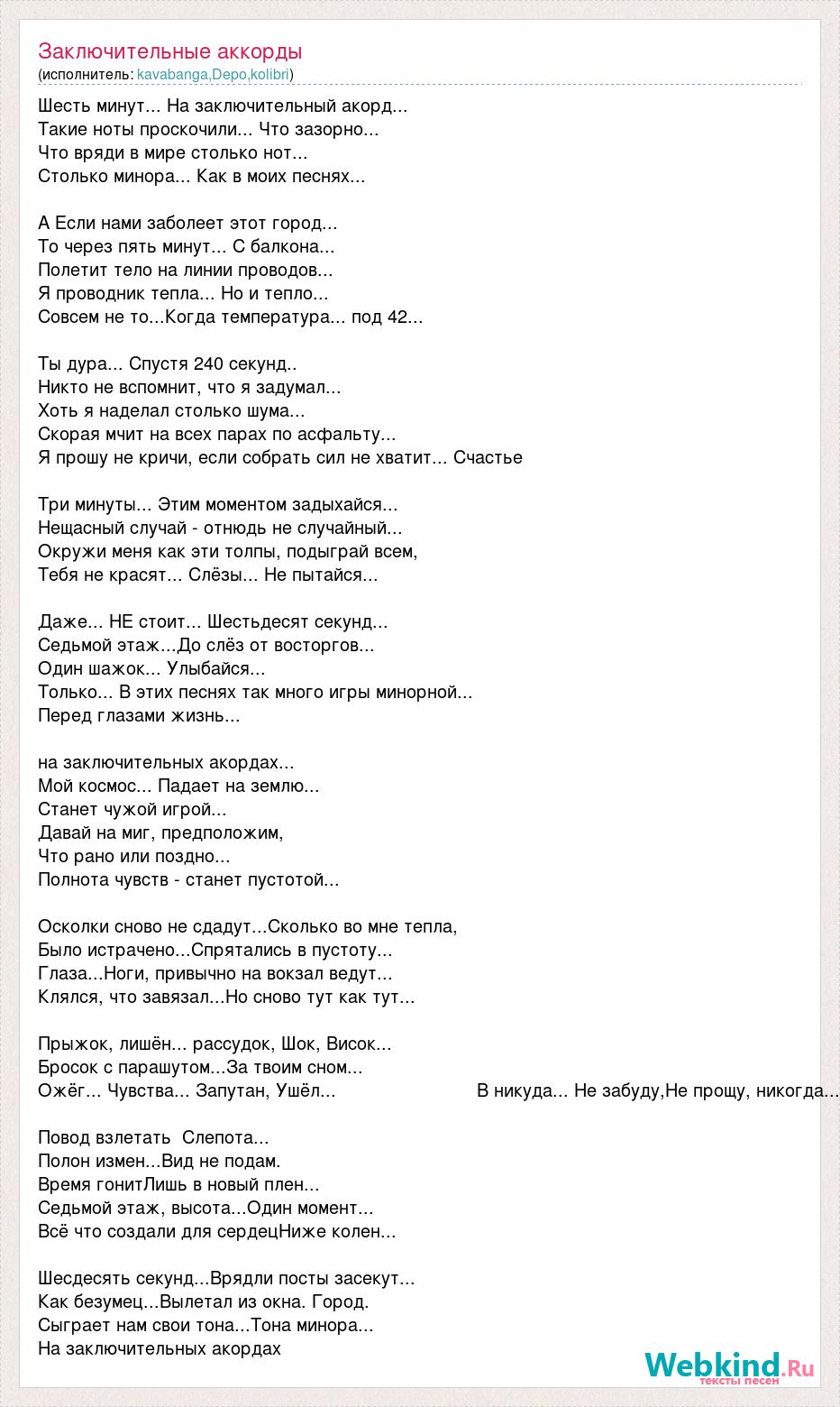 Шесть минут... На заключительный акорд... Такие ноты проскочили... Что зазорно... Что вряди в мире столько нот... Столько минора... Как в моих песнях... А Если нами заболеет этот город... То через пять минут... С балкона... Полетит тело на линии проводов... Я проводник тепла... Но и тепло... Совсем не то...Когда температура... под 42... Ты дура... Спустя 240 секунд.. Никто не вспомнит, что я задумал... Хоть я наделал столько шума... Скорая мчит на всех парах по асфальту... Я прошу не кричи, если собрать сил не хватит... Счастье Три минуты... Этим моментом задыхайся... Нещасный случай - отнюдь не случайный... Окружи меня как эти толпы, подыграй всем, Тебя не красят... Слёзы... Не пытайся... Даже... НЕ стоит... Шестьдесят секунд... Седьмой этаж...До слёз от восторгов... Один шажок... Улыбайся... Только... В этих песнях так много игры минорной... Перед глазами жизнь... на заключительных акордах... Мой космос... Падает на землю... Станет чужой игрой... Давай на миг, предположим, Что рано или поздно... Полнота чувств - станет пустотой... Осколки сново не сдадут...Сколько во мне тепла, Было истрачено...Спрятались в пустоту... Глаза...Ноги, привычно на вокзал ведут... Клялся, что завязал...Но сново тут как тут... Прыжок, лишён... рассудок, Шок, Висок... Бросок с парашутом...За твоим сном... Ожёг... Чувства... Запутан, Ушёл... В никуда... Не забуду,Не прощу, никогда... Повод взлетать Слепота... Полон измен...Вид не подам. Время гонитЛишь в новый плен... Седьмой этаж, высота...Один момент... Всё что создали для сердецНиже колен... Шесдесять секунд...Врядли посты засекут... Как безумец...Вылетал из окна. Город. Сыграет нам свои тона...Тона минора... На заключительных акордах
